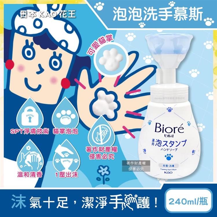 日本KAO花王-Biore蜜妮貓掌造型綿密泡泡溫和潔淨洗手慕斯240ml/手壓瓶(弱酸性泡沫去污洗手乳/手部護理香氛清潔露/家庭用趣味淨膚潔手液)