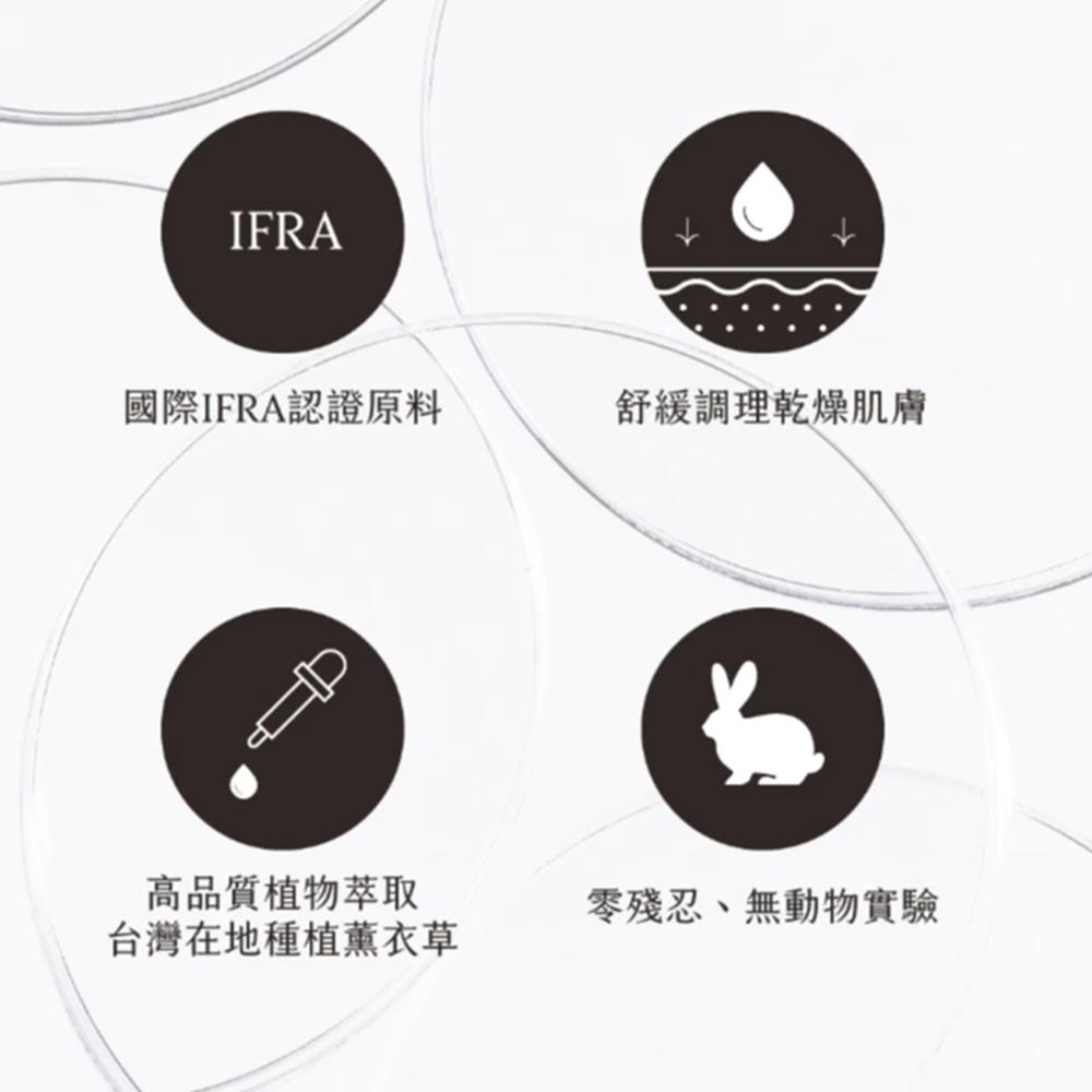以天然植萃原料調配而成,由純淨山泉水蒸餾萃取而出『台灣在地種植薰衣草純露』