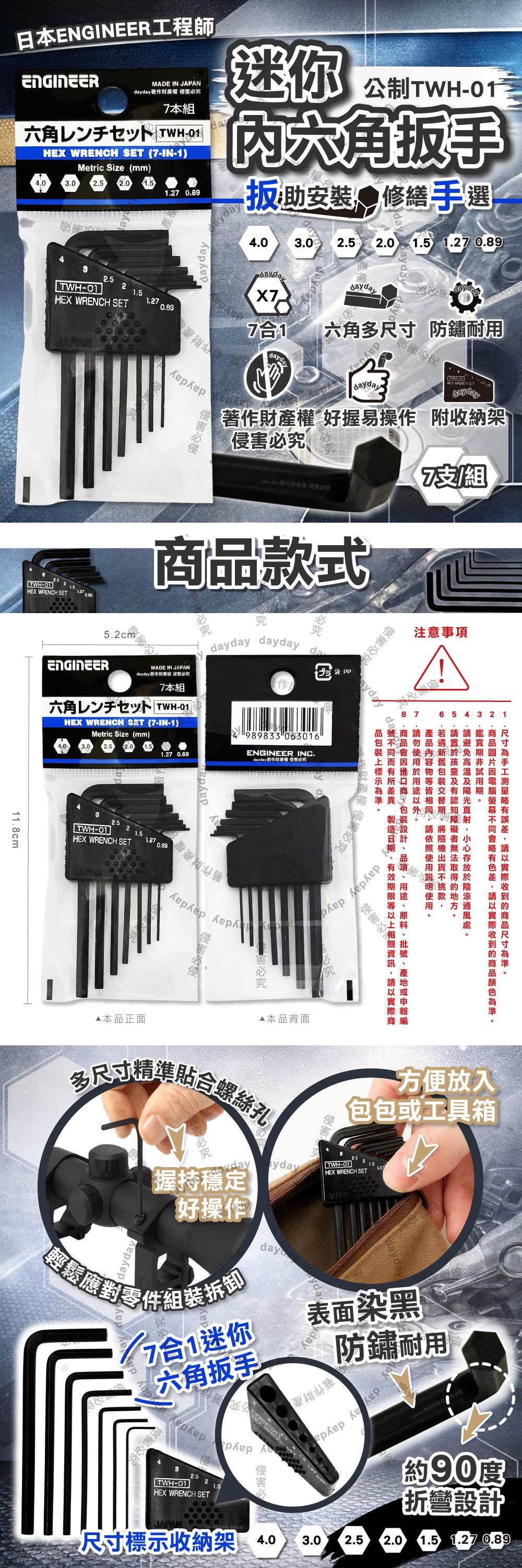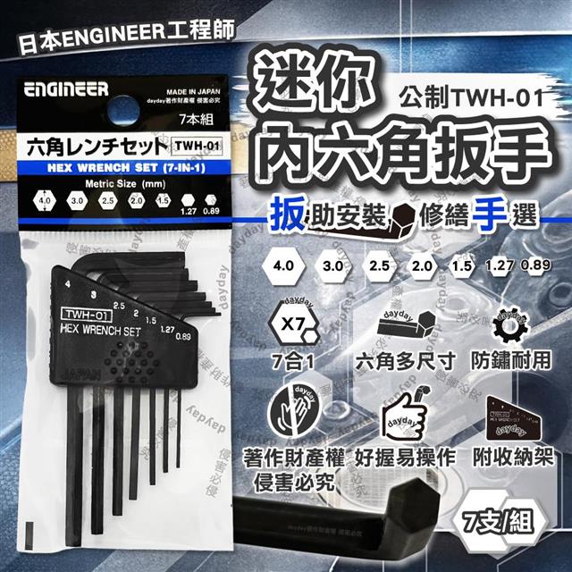 日本ENGINEER工程師-0.89-4.0mm迷你內六角扳手7支/組-公制TWH-01 (L型精密零件螺絲起子/防鏽耐用便攜五金配件組/器械手動組裝維修工具)