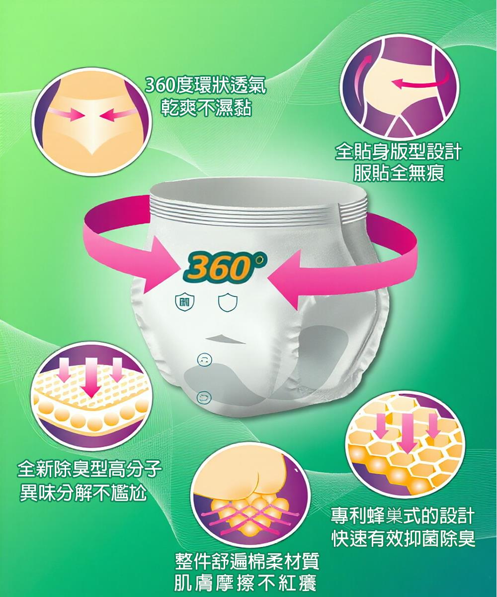 ☆親膚棉柔材質長效乾爽、強韌耐用不變形 ☆360°環狀透氣不悶熱、舒適清爽不黏膩 ☆蜂巢導流快速吸收不回滲、瞬吸鎖水防漏安心 ☆抑菌除臭少異