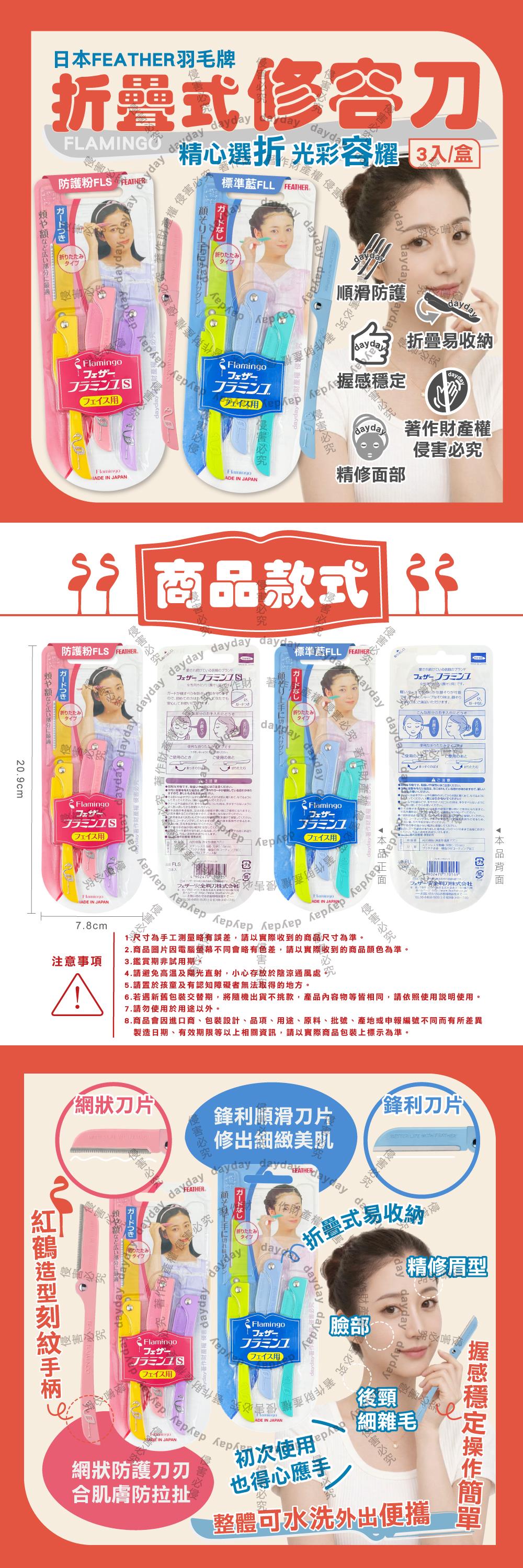 日本FEATHER羽毛牌-FLAMINGO便攜易收納不鏽鋼折疊式修容刀3入/盒(仕女臉部眉型後頸美容刀/順滑可水洗細部剃眉刀/紅鶴造型手動刮毛工具)