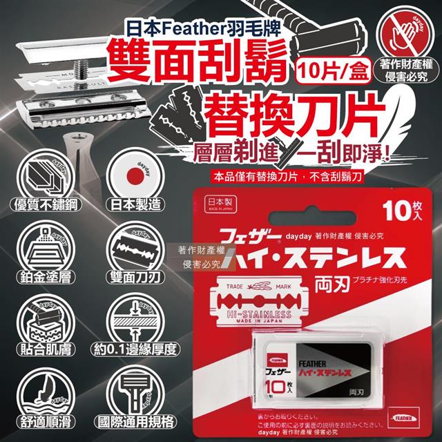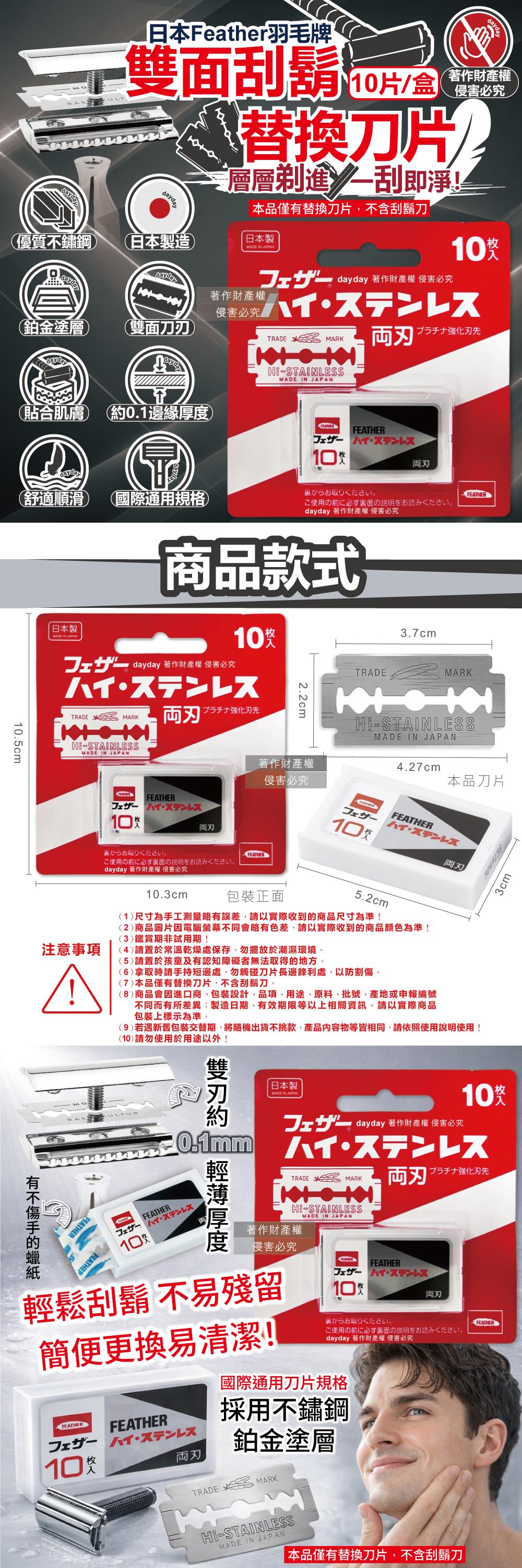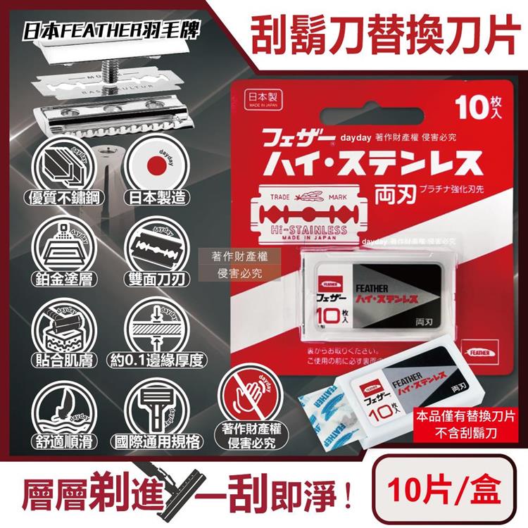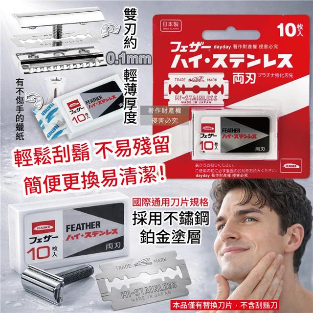 日本Feather羽毛牌-男士雙面鉑合金刮鬍刀替換刀片10片/盒FH-10B (本品不含刮鬍刀/臉部修容刀片/鬢角美型不鏽鋼剃刀片/國際通用刀片規格)