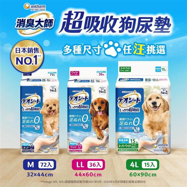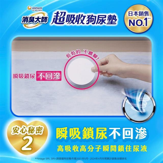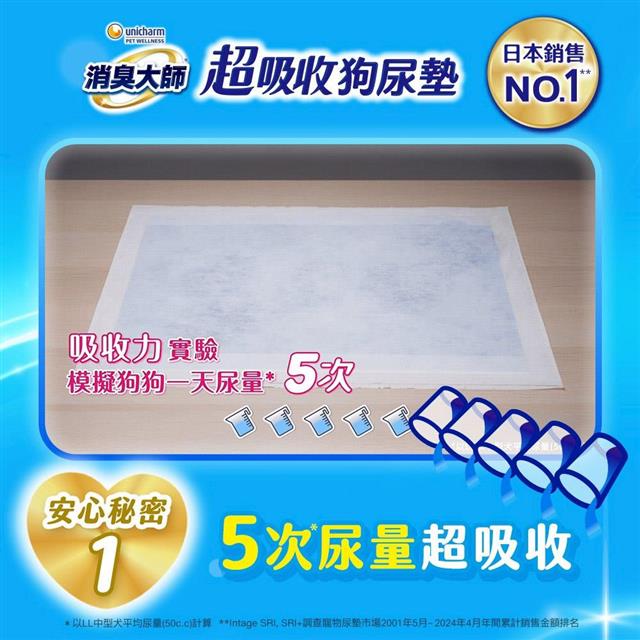日本Unicharm嬌聯-消臭大師無香消臭高效鎖尿防回滲超吸收狗尿墊1袋(高分子防漏尿布墊/平面式犬用廁所/定點訓練寵物隔尿墊/約3~5次吸尿量)