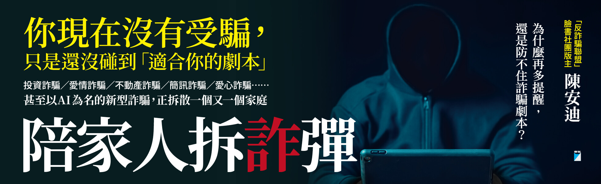 十三年,九次詐騙。陳安迪的父親一次次從情感陷阱,跌進投資騙局……從受害者家屬到反詐行動者,他親眼見證無數家庭被詐騙劇本推向崩壞,也看見防詐其實是一場關於信任、孤單與制度漏洞的集體考驗。內容簡介: 投資詐騙/愛情詐騙/不動產詐騙/靈骨塔詐騙/簡訊詐騙/電話詐騙/愛心詐騙/宗教詐騙……甚至以AI為名的新型詐騙,正拆散一個又一個家庭。你現在沒有受騙,只是還沒碰到「適合你的劇本」。在這個「劇本化詐騙」的時代,沒有誰能全身而退。防詐,不是一個人的事,而是一門需要全家共同參與的功課。/防詐是長期守護,而非一次性救援。在這場對準人心的戰爭,想保護家人,必須先理解──他們為什麼會受騙。當你說:「這個帳戶很可疑。」長輩聽到的是:「你覺得我笨。」當你說:「新聞一直都有報。」長輩聽到的是:「你覺得我老了、不會判斷。」當你說:「你為什麼不聽我的?」長輩聽到的是:「你不是擔心我,你只是怕被拖累。」當詐騙進入家庭,衝突、羞愧與失控,往往比金錢損失更致命。也因此,真正需要修補的,從來不是帳戶,而是關係。而關係之所以會被撕裂,不是因為有人愚蠢,而是詐騙本來就精準地瞄準了人心。它利用的不只是貪念,還有孤獨、被需要的渴望,以及對數位世界的不安,讓人一步步走進量身打造的陷阱。●●陳安迪因父親九度陷入詐騙,經歷憤怒、崩潰與無數次的挫敗。從受害者家屬到反詐行動者,他親眼見證無數家庭被詐騙劇本推向崩壞,也看見防詐其實是一場關於信任、孤單與制度漏洞的集體考驗。《陪家人拆「詐」彈》寫給正在陪伴長輩、承接傷害的家人,陪你看懂人心、守住關係,拆除那些精心設計的詐騙陷阱。──────────────────▍本書特色:●十三年,九次詐騙。我的父親一次次從情感陷阱,跌進投資騙局……打詐是一場看不到盡頭的馬拉松。詐騙集團不會因為我的存在而消失,但我始終堅持一個信念──能救一個,是一個。或許父親永遠無法完全清醒,但每當有一個家庭因此避免受騙,每當有人重新站起來對我說一句「謝謝」,我就更加確信──這份化小愛為大愛的使命,值得我用一生去實踐。──陳安迪●林書立(反詐騙聯盟祕書長、銘傳大學犯罪防治學系助理教授)──本書從詐騙被害人家屬的角度出發,深刻理解被害家庭所承受的痛苦,並將這份傷痛轉化為推動反詐欺的力量。反詐騙是一場永無止境的戰爭。我們除了正面迎向反詐欺議題,更需要修復那些受傷的夥伴,讓詐欺犯罪的被害人得以遠離憂傷、重新面對生活。本書也提醒我們,唯有從被害心理出發,才能更清楚看見詐欺問題的本質。 ●黃仕翰(律師、德益法律事務所所長)──作者多年來為打詐奔走,那份不計代價、出錢出力的真誠,不僅整合了社會良善資源,也深深觸動了我。親見他的付出後,我率領事務所團隊全力投入,期盼成為這道社會安全網最堅實的法律後盾。這本書將第一線經驗化為守護大眾的力量,誠摯推薦給每一位想保護身邊親友的人。▍各界專業人士打詐推薦!牛叔(「牛叔雜貨店」頻道創辦人、打詐內容創作者)林書立(反詐騙聯盟祕書長、銘傳大學犯罪防治學系助理教授)林意蓉(Gogolook公共事務總監)曹冀魯(台北市配音人員工會理事長、聲音導演)黃仕翰(律師、德益法律事務所所長)歐馬克(蒐集不能說的祕密的《馬克信箱》主持人)鄧萬偉(STARBIT暨Jcard執行長)戴伸峰(國立中正大學犯罪防治學系教授)蘇益賢(臨床心理師)__依姓氏筆劃順序排列──────────────────▍把詐騙搬上桌,從四件事開始:一、資訊共享,彌補盲區:分享可疑訊息、投資廣告或交友對象,累積家庭的「防詐資料庫」。二、打破資訊繭房:跨世代交流,降低被量身訂做的風險。三、建立集體智慧,創立防詐SOP:可疑網站或訊息,先放到群組,讓全家一起查證。四、讓對話成為日常:讓「防詐話題」成為家庭的共同語言。