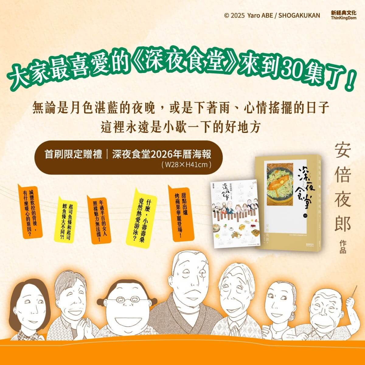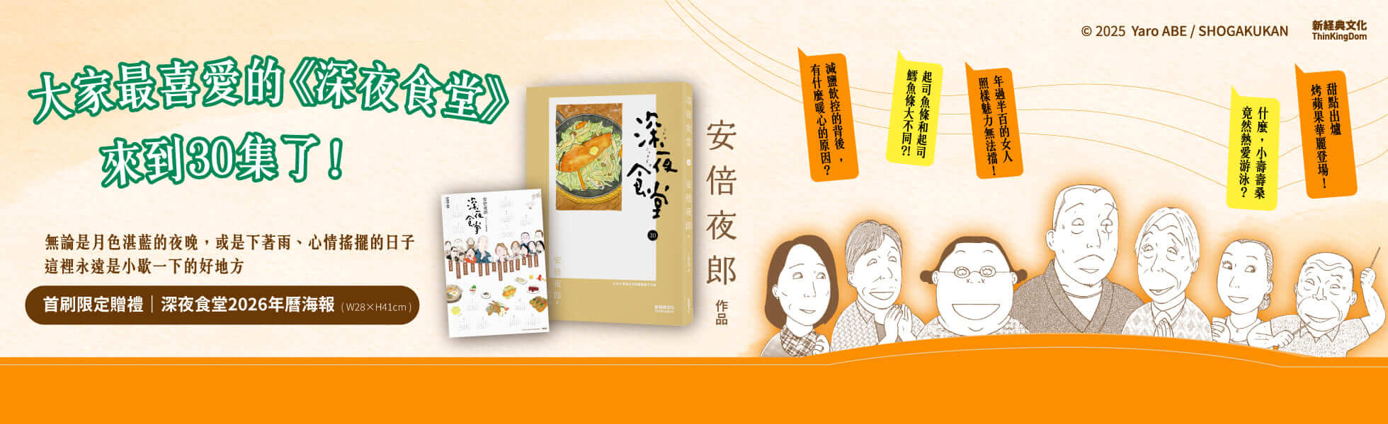 陪伴我們十餘年的《深夜食堂》,這回來到30集!	人情味更濃了,人生面向更多了,時間的滋味也更深刻了~		慶祝30集上市,首刷限定贈禮:《深夜食堂》2026年曆海報	讓溫暖與療癒,繼續陪你新的一年			【《深夜食堂》2026年曆海報說明】	內容:2026年曆(含日文紀年及月份)、回憶滿點的常客與作者自畫像、暖心暖胃的招牌菜	尺寸:28*41公分,直式	紙張:精緻美術紙	印刷:單面彩色印刷+水性平光	贈送方式:首刷隨書附贈,二刷起不再提供,亦不可單獨販售		【本集精華】	•追求健身夢想的同時,還能保有原本的生活嗎?	•睡神傳說:75歲、總是穿著豹紋衣的豪爽媽媽桑,能讓男人出人頭地!	•什麼,小壽壽桑竟然熱愛游泳?	•年過半百的女人,魅力照樣無法擋!	•甜點出爐:烤蘋果華麗登場!	•減鹽飲控的背後,有什麼暖心的原因?	•起司魚條和起司鱈魚條大不同?!	•當花心男遇上可以交換伴侶的手帕交……		無論是月色湛藍的夜晚,或是下著雨、心情搖擺不定的日子,	這裡永遠是小歇一下的好地方。			深夜食堂全新一集,動人上菜——		★感動無國界,台、日、韓、港、中、法全系列銷售突破6,000,000冊	★好評不斷,日本6度改編影視,國際改編韓語版、華語版接連上菜	★榮獲第55回小學館漫畫賞、第39回漫畫家協會大賞		方序中、比才、毛奇、馬世芳、洪愛珠、初聲怡、李政道、	番紅花、詹姆士、葉怡蘭、盧怡安、韓良憶、劉昭儀 好評推薦			◎「深夜食堂,歡迎光臨!」總有那麼一個地方,大門隨時為你而開	  歡迎光臨!今晚想吃什麼?不論是常客,還是新客人,在「做得出來就做」的營業方針之下,都能點到心中想吃的那道菜。入夜後,這家小店永遠等著你光臨,想吃什麼就點什麼,大門隨時為你敞開。		  安倍夜郎筆下的《深夜食堂》裡,每則故事獨立成篇,不必擔心跟哪個角色不熟,突然想念哪道菜就能翻閱,想進去坐隨時可以從任何一集坐進來。在這裡,每道料理雖然獨立,吃入口中的感受卻是共通的。透過14道日式家常菜,參與這些食客的人生際遇,時而溫馨,時而開懷,偶爾也令人鼻酸。簡短的是故事,漫長的是人生,持續邀請你掀開暖簾入店來,用他們短短的故事,陪伴你面對長長的人生。		◎百萬讀者齊聲讚:每一夜故事都回味無窮!	「人和人之間的牽絆,讓《深夜食堂》一點都不平凡。」	「讀完像喝了一杯熱茶,讓人打從心底暖和起來。」	「一部大人的漫畫,闔上書後更有勇氣面對自己的人生。」	「食物帶來的感動來自回憶。因為有這些回憶,人生所有美好不美好,都是圓滿。」	「一天的疲累像被洗淨一般,胸口脹滿溫暖。」	「濃濃的人情味,看似平凡,但在這裡找得到其他地方沒有的味道。」	「這種踏實的感動,就是人生吧!」	「不轟轟烈烈,平凡簡單如料理本身,這種純粹在心頭留下陣陣漣漪。」	「畫風濃郁且獨特,帶著一股令人平靜的力量,讀完心情也跟著暖和起來。」	「每個人心中都有一道能讓自己安心的菜餚,只有品嚐這道料理的人,才明白那彼此相依的羈絆。」
