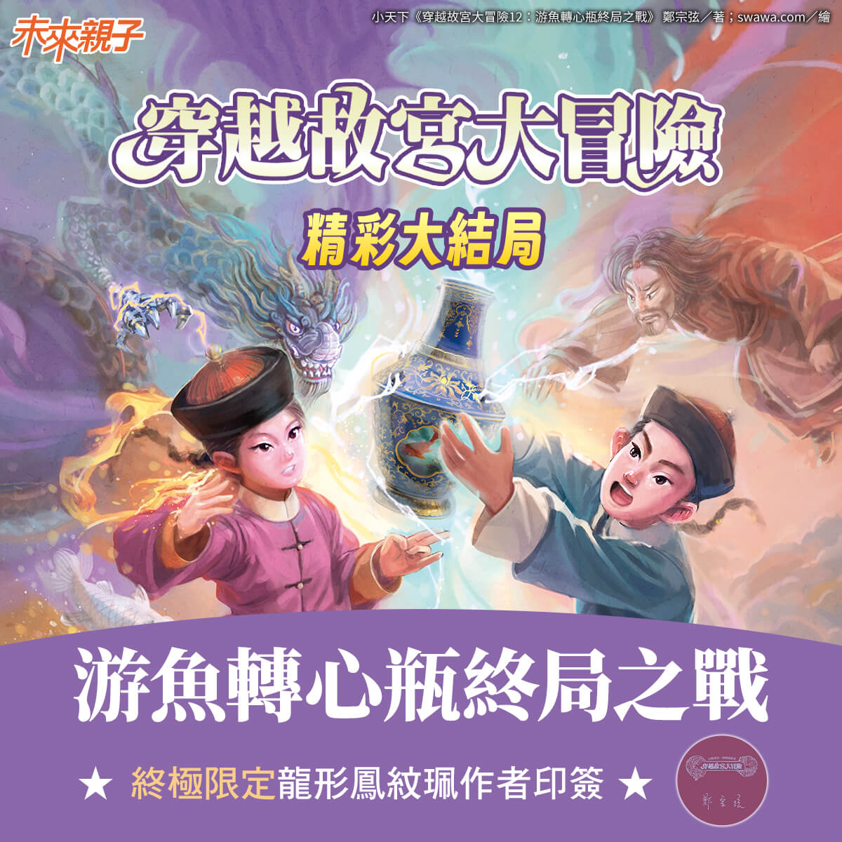 「穿越故宮大冒險」系列橫掃各大書店暢銷排行榜  風靡校園的奇幻冒險故事暢銷得獎作家 鄭宗弦 經典力作穿越時空 X 故宮國寶 X 正反派對決精彩大結局「故宮國寶」成了拯救世界的關鍵!酷必剋抓齊「天之四靈」,即將變身成無敵寰宇酷帝魔!唯一破解提示,竟然跟《紅樓夢》的賈寶玉有關?阿志、高娃和精靈們能安然度過浩劫嗎?終極大戰一觸即發,結局緊張刺激,超乎想像力之大成!最具文化視野的原創青少年奇幻小說,一次穿越歷史、文物、成長文學召喚熱愛閱讀的你,展現穿梭古今的冒險魂!秦始皇的廿六年詔橢量能啟動最駭人的神鬼咒?《紅樓夢》藏有讓寰宇帝魔永生不死的稀世珍寶?霽青描金游魚轉心瓶急急轉動,大災難即將降臨……當龍形鳳紋珮綻放光芒,就是穿越故宮大冒險的時刻!【主要系列人物】  阿志:11歲,文武兼備,喜歡閱讀歷史故事,還能上場演出歌仔戲。對故宮國寶相當著迷,甚至因此展開一趟又一趟不可思議的冒險旅程……  高娃:11歲,機敏、勇敢的清朝蒙古格格,曾被變成螽斯,困在翠玉白菜上一百多年;如今藉著龍形鳳紋珮的神奇靈力,以「陳娃娃」身分留在現代的臺灣……  酷必剋:清朝法力高強的蒙古黑巫師,見到原本屬於高娃、具有穿越時空靈力的龍形鳳紋珮,激起他建立大帝國、恢復成吉思汗榮光的野心……【故事簡介】酷必剋抓走了「天之四靈」後,狂風雷電不斷襲擊全球,甚至引發大停電!為了阻止酷必剋的駭人計畫,阿志和高娃再度穿梭時空,尋找「寰宇帝魔生成神鬼咒」三大要素:「仙壽寶玉」、「金詔橢量」和「新樣魚兒轉圈圈」,因而走進《紅樓夢》裡的大觀園、在咸陽宮見證了秦始皇統一天下,更得以一窺江西景德鎮「御窯廠」的製瓷機密。沒想到酷必剋緊追不捨,不但施咒闖進大觀園抓人、操控十二金人和兵馬俑展開圍攻,最終還成功變身成可怕的「寰宇帝魔」……眼看著恐怖浩劫即將降臨,故宮國寶成了戰勝邪惡的關鍵!  首度以「故宮國寶」為主題的奇幻冒險故事,精彩絕倫的本土青少年系列小說!繼《翠玉白菜上的蒙古女孩》、《肉形石的召喚》、《天靈地靈毛公鼎》……《掐絲琺瑯寶盒青龍劫》和《大唐仕女俑怪咒馴白虎》之後,終局之戰一觸即發!現在就翻開這本書,跟著書中兩位主角穿梭時空到清代與秦代,搶先尋得「霽青描金游魚轉心瓶」、「廿六年詔橢量」,拯救全世界!重磅教師 聯名推薦(依姓氏筆畫順序排列)宋怡慧(新北市丹鳳高中圖書館主任)呂  捷(歷史老師)林文寶(國立臺東大學兒童文學研究所榮譽教授)林怡辰(彰化縣原斗國小教師)尚瑞君(專欄作家/講師)施慧美(臺中市忠孝國小英語教師暨圖推教師‧曾獲頒教育部閱讀磐石個人獎)郝譽翔(知名作家‧國立臺北教育大學語文與創作學系教授)莊典亮(師鐸獎得主/兒童文學作家)許建崑(東海大學中文系教授)陳玉金(國立臺北教育大學語文與創作學系兼任助理教授)陳安儀(親職作家‧教育工作者)黃秀莉(南投炎峰國小資深閱讀教師、教育部閱讀推手獎得主)黃秋芳(知名作家)曾肅良(國立臺灣師範大學藝術史研究所教授)綠君麻麻(閱讀推廣人‧作家)蔡明灑(朗朗小書房創辦人‧新竹市共讀推廣協會講師)【專文推薦】 「穿越故宮大冒險」系列自出版以來,作者鄭宗弦成功將歷史與文物轉化為奇幻旅程的契機,使讀者在緊湊的劇情中認識文化資產。他以臺北故宮博物院為核心舞臺,結合國寶文物、歷史人物與奇幻冒險,建構出一個「古物有靈」的異境宇宙。整個系列在第十二集達到主題性的收束與總結,昇華為一則「文化守護寓言」:從翠玉白菜到游魚轉心瓶,十二次的穿越引領讀者進行一場場深度文化探索。當孩子闔上書本,他們或許會明白:在每一件古物、每一副卷軸、每一段歷史背後,都潛藏著故事的力量。而這正是兒童幻想文學最珍貴的禮物。                                     ──國立臺東大學兒童文學研究所教授  黃雅淳  【穿越故宮大冒險】系列★最受全臺中、小學生歡迎!本土原創奇幻冒險小說★穿越時空為引子,故宮國寶為根本,歷史朝代為脈絡★勇闖古今護國寶!解鎖咒語破難關!【系列特色★五星好評】特色1 故事刺激緊湊,輕鬆讓孩子累積4萬字的閱讀成就感特色2 每集收錄〈大冒險知識時間〉,結合史實,擴充孩子的國學知識特色3 囊括故宮熱門文物,增進跨領域人文素養與視野特色4 正反派鬥智劇情,培養良善價值觀全系列重磅推薦(依姓氏筆畫順序排列)Sama  (知名閱讀部落客)吳淡如 (暢銷作家‧知名節目主持人)吳密察 (國立故宮博物院前院長)宋怡慧(新北市丹鳳高中圖書館主任)呂  捷 (歷史老師)林文寶 (國立臺東大學兒童文學研究所榮譽教授)林世仁 (知名兒童文學作家‧《我的故宮欣賞書》作者)林正儀 (國立故宮博物院前院長)林怡辰 (彰化縣原斗國小教師)尚瑞君(專欄作家/講師)施慧美(臺中市忠孝國小英語教師暨圖推教師‧曾獲頒教育部閱讀磐石個人獎)秦嗣林 (鑑定專家‧暢銷作家)郝譽翔 (知名作家‧國立臺北教育大學語文與創作學系教授)莊典亮(師鐸獎得主/兒童文學作家)許建崑 (東海大學中文系教授)陳玉金(國立臺北教育大學語文與創作學系兼任助理教授)陳安儀 (親職作家‧教育工作者)陳郁如(暢銷書《修煉》與《仙靈傳奇》作者)黃秀莉(南投炎峰國小資深閱讀教師、教育部閱讀推手獎得主)黃秋芳(知名作家)黃雅淳(國立