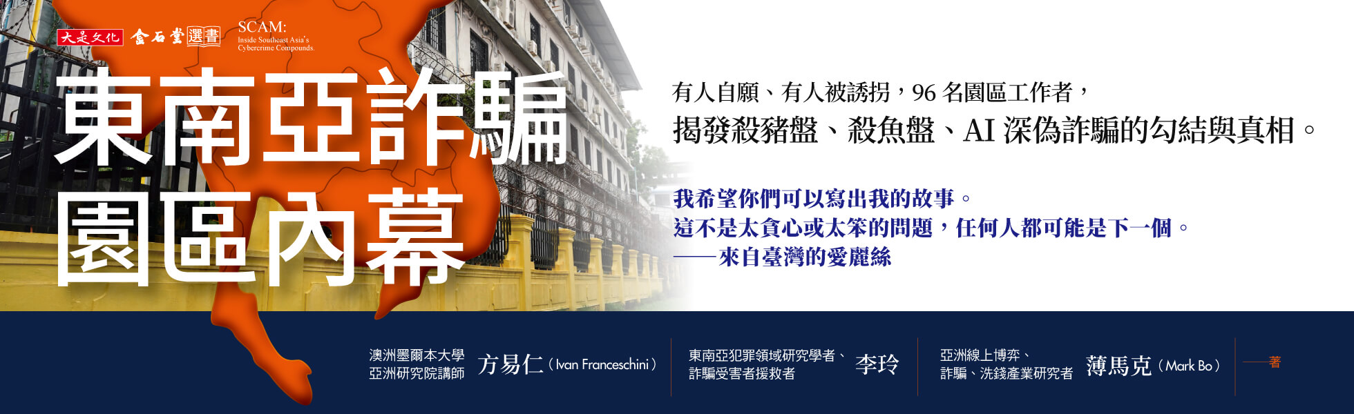 我希望你們可以寫出我的故事。這不是太貪心或太笨的問題,	任何人都可能是下一個。 ──來自臺灣的愛麗絲			◎這些人都是太傻或太貪?詐騙集團狩獵的管道多達7種,誰都可能「被錄用」。	◎詐騙組織也講人事制度:頂端是「狗莊」,中層主管、訓練組長各有專長。	◎假檢警已過時,動物系詐騙(殺豬盤、殺魚盤)、「AI深偽詐騙」才是主流。		2023年,全球至少有12萬人在緬甸、10萬人在柬埔寨,從事網路詐騙。	有些人的確因想賺大錢而自願入場,但多數人都是被誘拐進入。		本書匯集3位作者多年來在東南亞(以柬埔寨為主)的實地調查,	並訪談來自12國、共96名曾在園區工作者(包含臺灣):	為了還債,被仲介騙入KK園區的中科院博士、	誤信直播平臺廣告,被暴力逼迫做詐騙的17歲工地少年,	幫人到泰國代購佛具,卻被送到緬甸賣淫和行騙的女子……。		看完這些遭遇,你還是自認沒那麼傻、沒那麼倒楣?	這不是太笨或太貪的問題,而是你還沒遇到為你寫的腳本。		◎惡夢的開場		.工作描述很模糊、其他都很具體的徵才廣告	「找工作嗎?男女皆可,年齡18歲~30歲,月薪30,000元,	表現佳可加薪,包住宿。基本條件:會打字、會中文。」		哪裡可疑?如果你沒察覺異樣,詐騙分子盯上的,正是你。		.多數人都是被自己人給賣了	一起玩遊戲的網友、對你特別溫暖的同事、很久沒聯絡的遠房親戚,	突然報給你一個不錯的工作(賺錢、代購)機會,你以為撿到好康?	這就是誘餌……。		◎這裡應有盡有,宛如一座小城市		.這裡跟大公司一樣也有「人資」	新人要先受訓並隨機抽考,沒通過就受罰;	笨手笨腳?沒關係,只要願意配合,有腳本可照抄。	業績好,還能得到獎金、升遷、帶你去賭博、去買春……	一步步突破你的道德底線!		.從下餌到殺魚分工流程	頂端是「狗莊」,掌控全局;中層主管負責訓練、懲罰與鎖定潛在獵物;	最底層的「狗推/菠菜」,才是真正出面行騙的人。	下餌、網魚、殺魚是慣用的3階段詐騙手法。		◎想逃,不外三條路		請親朋好友籌贖金,但難保他不會吞了錢,再把你轉賣;	發訊息向政府求救,卻馬上傳回園區經理耳中,並銷毀證據;	找非官方求援得靠運氣,多數救援網紅只是想蹭熱度騙錢。	本書的這些倖存者是如何逃跑呢?		媒體報導這麼多、警察天天宣導,	還是這麼多人受害被騙?因為人最怕寂寞和絕望。	詐騙集團就是利用這一點為你寫腳本。