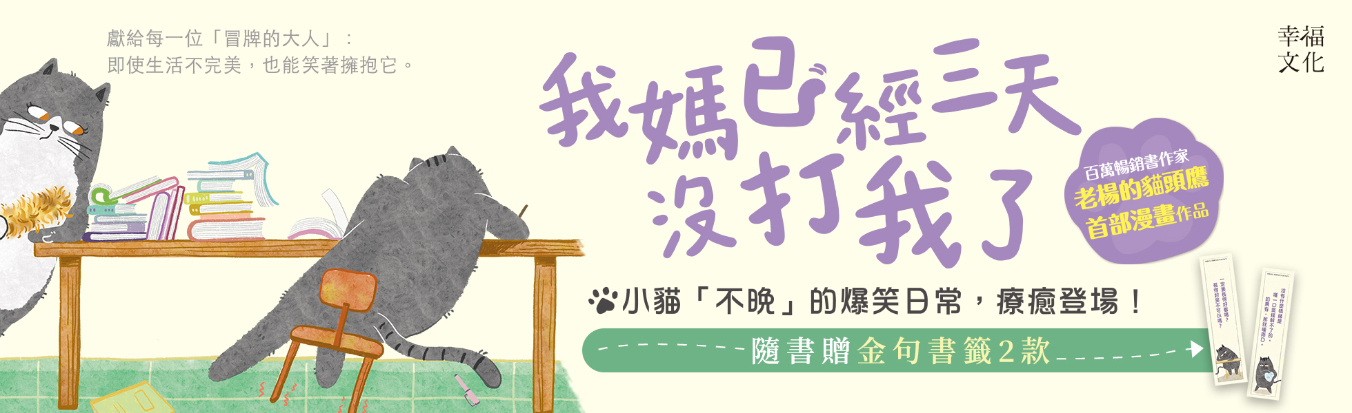 百萬暢銷書作家,創作的「醒腦之書」系列暢銷200萬冊。在犀利毒舌賽道勇往直前,獲得貓咪的肯定後,為時下年輕人創作了全新解壓漫畫《我媽已經三天沒打我了》,他說保證好笑!因為書中的每個故事都經過自家貓咪的肯定。