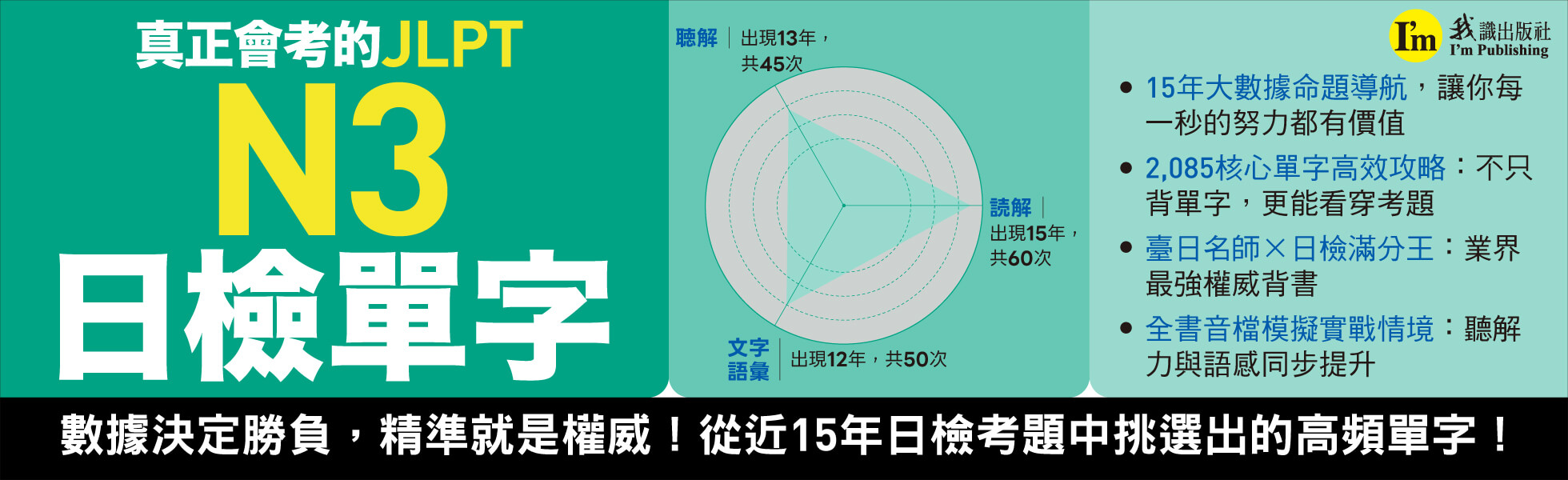 • 「時間有限、腦力有限!」要背就背真正會考的單字!「數據決定勝負,精準就是權威!」本書橫跨15年、共30回的日檢考古題大數據分析,透過「電腦」精密統計出現頻率,並由日檢N1滿分王「人腦」嚴格篩選,從上萬詞彙中去蕪存菁,精煉出 2,085個「核心必考單字」!如果你只有三個月、一個月,甚至一週就要進考場,你需要的只有「真正會考」的那一個單字!如果你只求高分過關,而不是要考滿分,那為什麼要浪費時間去背「根本不會出現在考卷上」的單字?這一次,我們不走冤枉路,這一次,我們只背一定會考的日檢單字!這15年來,會考的單字都在這裡了!如果考卷只會出現這2,085個核心單字,為什麼你要浪費時間背不會考的單字?數據說話!直擊JLPT N3命題核心,最精準的選字、最道地的用法,讓你帶著「正確答案」踏進考場!數據決定勝負,精準就是權威!用最高效率,換取N3合格證書!■ 15年大數據命題導航,讓你每一秒的努力都有價值蒐集近15年、共30回的考古題庫,利用大數據分析技術與專家二度篩選,徹底排除冷門、過時、低頻單字。這不僅是一本單字書,更是一份精準的命題地圖,確保你學的每一個字,都是考官的出題重點。■ 2,085個核心單字高效攻略:不只背單字,更能看穿考題嚴選最核心的2,085個單字,並針對考生痛點精準的高效攻略:1. 同反義字與衍生詞:建立網絡化記憶,學習效率翻倍。2. 名師考點筆記:詳細解析使用方式、易混淆意思、近義字辨析。3. 應試防錯指南:直接指出考生最易掉入的陷阱,一眼看穿出題邏輯。■ 臺日名師x日檢滿分王:業界最強權威背書集結日語檢定教學的專家,打造公信力最強的學習內容:1. 日籍老師:確保單字的重音、例句都道地流暢,符合實際生活語感。2. 臺籍名師:結合多年教學經驗,精準點出臺灣學生最容易出錯的盲點。3. 日檢滿分王:以「應試者」的視角進行審訂,傳授最高效的奪分筆記。■ 全書音檔模擬實戰情境:聽解力與語感同步提升全書單字、例句完整錄音,內容完全比照日檢考試的音速與情境。讓你利用通勤、零碎時間進行聽覺記憶,不只記住單字,更讓耳朵提前習慣考場節奏,同步強化聽解實力,打造絕對主場優勢。【本書適合對象】1. 想要求快、求準的考生:拒絕厚重的字典式背誦,只想鎖定必考範圍。2. 初次報考 N3的學習者:需要權威數據指引,建立學習信心。3. 遇到瓶頸的自學者:需要名師解析辨析相似字,破解日檢陷阱。數據不會騙人,精準就是你合格的保證。放棄無效學習,現在就開始這場「高勝率」的日檢挑戰!【使用說明】步驟1 建立基礎:熟練2,085核心單字本書蒐集近15年共30回考古題,透過電腦統計與專家二度篩選,徹底排除15年來低頻出現的贅詞,想要一次考過日檢N3,就務必要熟練這2,085個經過電腦統計與專家篩選的核心單字。步驟2 固定學習:每天學習70個單字養成每天固定學習的習慣,每天只要讀70個單字,熟悉單字的用法,建立大腦記憶,只要30天就能掌握日檢N3必考的2,085個核心單字。步驟3 理解語境:日籍老師審訂例句背單字最怕知道意思卻不會用,本書邀請日籍老師審訂例句,例句完全符合N3的程度與考場情境。透過例句,除了能掌握單字的意思與用法之外,還可以觀察單字在句子中的位置、助詞的搭配,有助於提升面對文字語彙、讀解題型的應考力。步驟4 掌握關鍵:必考單字高效攻略由臺籍名師與日檢滿分王聯手針對學習者盲點撰寫的補充內容,首先,從必考單字帶出衍生字、同義字、反義字,擴展單字量。再透過相似字或類似用法的解析,解決學習者的疑惑,最後搭配日檢滿分王的應考叮嚀,提醒容易失分的陷阱,一次考過日檢N3不是問題。步驟5 強化聽解:運用音檔熟練語感日檢合格的最後一塊拼圖是聽力,本書邀請日籍與臺籍老師錄製全書中日文單字與日文例句,幫助學習者掌握發音與語調。在準備考試的時候,還可以嘗試不看書,只使用Youtor App(內含VRP虛擬點讀筆)聽音檔,進行影子跟讀法,讓耳朵習慣日籍老師的語速與斷句。當你的耳朵習慣了,面對聽解考試便能游刃有餘。※本書不提供光碟及音檔下載。※音檔可離線聽取。[「VRP虛擬點讀筆」App及網頁版介紹]為了方便讀者更方便使用本書,特別開發「VRP虛擬點讀筆」(Virtual Reading Pen)App及網頁版雙版本,幫助讀者有效率地讀取本書相關的音檔。■ 線上下載「Youtor App」(內含VRP虛擬點讀筆)1. 在哪裡下載「VRP虛擬點讀筆」?(1)讀者可以掃描書中的QR Code連結,或是於App商城搜尋「Youtor App」下載即可。2. 為什麼會有「VRP虛擬點讀筆」?(1)以往讀者購買語言學習工具書時,為了要聽隨書附贈的音檔,總是要拿出已經很少在用的CD播放器或利用電腦轉存音檔到手機來使用,耗時又不方便。(2)坊間當然也有推出「點讀筆」來改善此種學習上的不方便,但是一支筆加一本書往往就要二、三千元,且各家點讀筆又不相容,CP值真的很低。(3)後來雖然有了利用QR Code掃描下載檔案至手機來聽取音檔的方式,但手機不僅必須要一直處在上網的狀態,且從掃描到聽取音檔的時間往往要花個5秒以上,很令人氣結。(4)因此,我們為了同時解決讀者以上三種困擾,特別領先全球開發了「VRP虛擬點讀筆」,並獲得專利,希望這個輔助學習的工具,能讓讀者不僅不用再額外花錢,且使用率和相容性也是史上最高。3. 「VRP虛擬點讀筆」就是這麼方便!(1)讀者只要透過書中的QR Code連結,就能立即下載「You