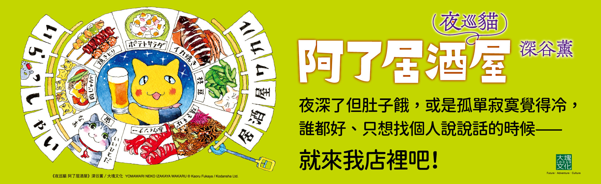 ☆《夜巡貓》的超人氣角色阿了單飛出書啦!直接閱讀OK!☆ 貓界的「深夜食堂」,阿了暖心居酒屋新開張!☆ 收錄68篇漫畫+加筆漫畫4P,還有手繪食譜+阿了親自繪製的《阿了傳》!☆ 第21回手塚治虫文化賞短篇漫畫賞得獎系列最新作。☆ 限量贈送「居酒屋」全彩明信片!(14.8×10cm)「夜深了但肚子餓,或是孤單寂寞覺得冷,誰都好、只想找個人說說話的時候——就來我店裡吧!」「阿了居酒屋,今天也有營業喔~」在《夜巡貓》系列作裡擁有超高人氣的迷人角色——阿了,這次放下實習生的身分,以「居酒屋老闆」的頭銜強勢回歸!《阿了居酒屋》是《夜巡貓》系列作的首部外傳,描繪阿了開了一家居酒屋,並與各式各樣的客人相遇、交流的溫暖日常。自稱可愛小貓的阿了老闆將用聊天、美酒與料理,款待那些有點寂寞的人、以及心中藏著無法對他人訴說事情的人類與動物們。在觥籌交錯、香氣四溢的阿了居酒屋裡,將會發生什麼樣的趣事呢?★「若不認爲自己辦得到,就什麼也辦不到啊。」有點白目、有點自戀、有點少根筋,但在本質上仍擁有善良而柔軟心腸的阿了,憑其獨樹一幟的行事作風和說話風格,在廣大的讀者群裡擄獲無數粉絲的心!在《夜巡貓》本傳裡,雖然阿了獨特的安慰方式總會讓被安慰的那方和讀者啼笑皆非,但傻里傻氣、天真爛漫的阿了,總能在蹭飯的同時端出一道道簡單卻可口的家常料理,溫暖人們的心和胃。於是深谷老師決定讓阿了開一間居酒屋!客人們聞香而來,眾人在這家小小的居酒屋裡,牽起更多的緣分、編織出有美食與彼此相伴的幸福時光。書中生動描繪阿了居酒屋的緣起、阿了和老奶奶阿幸的相處日常、以及阿了和牠的兄弟們「抹布阿飛」相遇的故事。溫柔中帶點笨拙、讓人無法不憐愛的阿了,這次也將以萬能的可愛征服眾讀者的心,絕對是《夜巡貓》的讀者乃至阿了的粉絲不容錯過的一部作品!★「記憶是會慢慢淡化的,不想忘記的味道和氣味也是。」除了療癒又幽默的故事之外,阿了也將獨家公開牠的私房食譜和菜單!從主食到甜點、從經典便當到創意料理、從詳細的食譜教學到多樣化的菜色搭配,全都詳盡收錄在本書中。舉凡:讓人懷念的拿坡里義大利麵、適合搭配氣泡飲的彩虹沙拉、簡單又好吃的醃菜、不愛吃甜食的人也能盡情享用的壽司蛋糕……琳瑯滿目、應有盡有,讀者不妨自己動手做做看!不僅如此,本書還特別收錄由阿了本喵親筆繪製的《阿了傳》!精彩絕倫的《阿了傳》一共六篇,作為閱讀過程中的休息點貫穿全書,讓讀者充分感受濃厚的阿了色彩,讀著讀著不由自主地會心一笑。本書作者深谷薰老師,也在她的個人X上特別提到:「在本書中,特別是全新繪製的後記故事漫畫,我傾注了滿滿心意在裡頭。明明頁數不多,想畫、想寫的內容卻不斷膨脹,所以不論是圖還是文字,我都畫得非常細緻——請一定要看看那些只有指尖大小的可愛角色們。這是一間能讓肚子與心都暖起來的,由受雇店長阿了經營的居酒屋。肚子餓的時候,感到寂寞的時候,記得想起這裡喔。」★「有你相伴的日子,都是無比珍貴、值得銘記一生的寶物。」正如讀者們所熟悉的《夜巡貓》,每一篇八格,不管翻到哪一頁都可以獨立閱讀。從任何一集開始翻也都不影響。即使讀過了,心累的時候隨手拿起來翻翻,都非常療癒。短短的八格漫畫,好像深谷老師用手摸了摸你的頭,說:「沒事的,一切都會沒事的。」如果是此前從未讀過任何一本《夜巡貓》的讀者,由超人氣角色阿了擔綱主角的外傳作品,將會是你入坑的最佳選擇!八格漫畫篇篇獨立,閱讀門檻為零,除了本篇漫畫還有多則私房食譜、可愛插圖,內容保證豐富,是愛貓人士和料理愛好者都該擁有的一部佳作。而若是早已加入《夜巡貓》宇宙的舊友也不必擔心,本書不時會有讓人眼熟的老班底客串登場,包含本傳主角遠藤、大灰貓阿宙、抹布阿飛及魔犬兄弟,都將作為故事彩蛋出現在不同篇章裡,等待讀者自行探索!★美味共同推薦(按姓名筆畫順序)「短短的篇幅,涵蓋了日常小敘跟料理,很適合在片刻的休息時間品嘗。推薦給忙碌卻又想好好療癒自己的人~」——艾莉柚(漫畫家)「撐過一天、鬆口氣舒適地坐下,《夜巡貓 阿了居酒屋》給我這樣的感覺。簡單的線條,盛起日常裡被忽略的溫熱與陪伴。」——韋蘺若明(漫畫家)