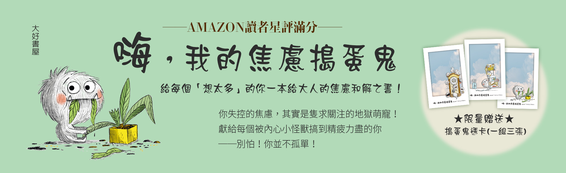 ──AMAZON讀者星評滿分──一本給大人的焦慮和解之書!★限量贈送「搗蛋鬼透卡」一組三張!★你失控的焦慮,其實是隻求關注的地獄萌寵!牠刷爆你的卡、搞砸你的約會,在你深夜時分胡言亂語⋯⋯ 獻給每個被內心小怪獸搞到精疲力盡的你──別怕!你並不孤單!你也是這樣嗎?✔ 傳出訊息後,不斷重看對話、懊悔自己說錯話了✔ 腦中總有小劇場,反覆預演還沒發生的災難✔ 社交場合後電力耗盡,需要獨處好幾天才能回血✔ 習慣性拖延,直到死線前一刻才被焦慮追著跑✔ 總是追求完美,一個小瑕疵就足以讓你整天心情不好───這樣的你,絕對需要這本書!◎給每個「想太多」的你,溫柔理解、陪伴內心的地獄萌寵你的腦中是否三不五時有個聲音跳出來大聲嚷嚷?那是你內心的搗蛋鬼──「焦慮」在作祟。牠可愛卻磨人,在你緊張時把一切搞砸、在你疲憊時擅自吃光所有食物、在你需要冷靜時刷爆你的信用卡⋯⋯別急!你不必消滅牠,而是要學會如何「馴養」牠。好比說,帶牠去散步、教牠冥想,甚至給牠一本專屬的日記⋯⋯你會發現,這隻失控的地獄萌寵,將成為你最獨特的夥伴。◎不只是療癒,更是你隨身的情緒馴獸師!焦慮不是敵人,牠只是隻還沒被馴服的小怪獸。本書將抽象的情緒化為具體圖像,提供一套完整的「馴養指南」,讓你從今天起,拿回人生的主導權!◆STEP 1:認識內心的小怪獸──焦慮行為辨識牠是不是把你的生活搞得一團亂?讓你緊盯著手機發出後悔莫及的訊息?在重要場合腦袋一片空白?本書生動的插圖讓你一眼認出焦慮的各種化身,完成自我覺察的第一步。◆STEP 2:學習餵養與引導──情緒引導SOP別再跟這隻焦慮搗蛋鬼硬碰硬!書中提供一套清晰的「調教」策略,你可以立刻上手:✦重塑思維:餵牠吃正向的思維零食。✦身體活動:帶牠出門跑跑步、散散步,消耗多餘精力。✦靜心練習:教牠深呼吸與冥想,找回平靜。✦情緒疏導:給牠一本專屬日記,讓牠把所有壞情緒一吐為快。✦自我關懷:在牠崩潰後,給自己和牠一個安靜的復原空間。◆STEP 3:成為焦慮搗蛋鬼的靈魂隊友──從「對抗」到「共存」記住,這隻寵物有自己的生命,硬是關住牠只會讓牠更具破壞力!學會將焦慮搗蛋鬼視為自己的一部分來培育,理解「我們都只是在盡自己最大的努力」。當你不再是失控的飼主,而是懂得引導的隊友時,你就真正與自己和解了。這是一份溫柔的理解,一個告訴你「我們都一樣,都正在努力」的溫暖擁抱;也是一份充滿關懷與支持的暖心禮物,適合送給正在經歷情緒困擾、壓力龐大的朋友、家人或自己,在會心一笑中得到釋放與療癒。它無聲地說著:「我懂你,你已經做得很好了。」【共感推薦】LuckyLulu/圖文作家小鬱亂入Depressy trouble王雅涵/心理師艾彼/BeyondMirror創辦人、諮商心理師李郁琳/臨床心理師、作家胡展誥/諮商心理師洪培芸/臨床心理師、作家郭源元/最辣圖文創作者(按首字筆畫排序)「焦慮小怪獸壞壞惹人愛,就跟我們身邊的寵物一樣,用幽默風趣的角度來面對它吧~~」──王雅涵/心理師「這本書把焦慮外化成小怪獸、小寵物,用可愛的圖像和語句,讓我們理解自己內在焦慮情緒與各種焦慮失控的行為模式。下次當你感受到焦慮,別急著逃離,想像書中的小怪獸抓狂的樣子,然後溫柔地安撫牠!焦慮,也很可愛。」──艾彼/BeyondMirror創辦人、諮商心理師【美國讀者絕讚推薦】「我愛死這本書了!這是一本搭配有趣插圖的讀物,非常適合任何曾與焦慮交手過的人。它讓你感覺被看見了,是一份很棒的禮物!」「這本書完美地描繪了我的感受,它以一種幽默的方式呈現,讓我不再感到那麼孤單。」「這本書太棒了,如此的真實!插圖完美地捕捉了焦慮的感覺。」「對於任何處理焦慮問題的人來說,這本書帶來了巨大的認同感和共鳴。插圖很可愛,並且真正捕捉到了焦慮看起來和感覺起來的樣子。強力推薦!」【本書特色】1.插畫風格生動可愛,文字詼諧有趣,以輕鬆的方式探討深刻的心理議題。2.正向的應對姿態:書中不僅呈現焦慮帶來的混亂,更重要的是,展現了主角如何積極學習「調教」牠,包含運動、冥想、寫作與自我關愛⋯⋯等,提供經過驗證、溫和且有效的實踐路徑。