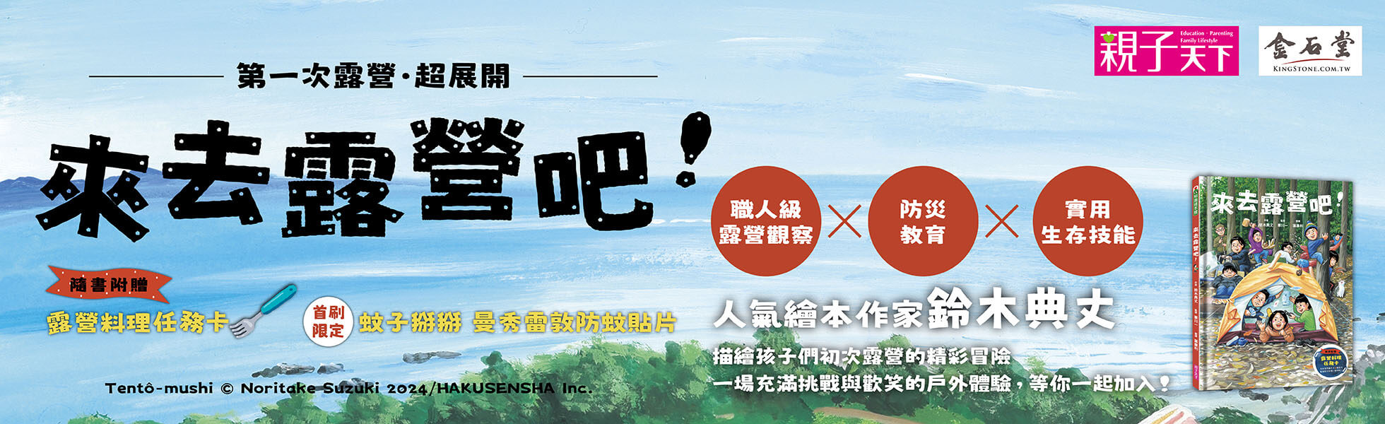 ~獻給最喜歡戶外探索、自然野趣的你~升營火、劈柴、搭帳篷、夜晚的悄悄話……第一次露營,既緊張又興奮!跟著最會描寫細節的鈴木典丈,一起展開一場紙上的露營體驗!Ψ首刷限量附贈【曼秀雷敦天然防蚊貼片】&【露營料理任務卡組】ψψ幫你變身野外生活小達人!ψ要在哪裡搭帳篷才最合適?營火要怎樣才能順利升起?自己動手做的料理會不會特別好吃?漫漫長夜裡,又要和大家聊些什麼呢?營火旁的大鍋料理正翻騰著熱氣,誘人的烤肉香飄浮在夜色裡。鈴木典丈以細膩生動的畫面,帶領讀者身歷其境:彷彿聽見火焰的劈啪聲,甚至感受到晚風的涼意。從升營火、搭帳篷,到煮晚餐、仰望星空、分享心事──每一件事都不只是「活動」,而是孩子學習獨立、觀察自然、動手實作的開始。你以為露營只是吃東西、睡帳篷嗎?其實,冒險就藏在這些細節裡!本書生動呈現孩子們的第一次露營經驗。不論是和家人一起去海邊,還是和朋友相約森林,他們都要用自己的雙手,面對挑戰、解決問題,並與同伴一起度過熱鬧又難忘的夜晚。從害怕到期待,從不安到興奮,露營的每一步,都充滿成長與驚喜。中文版更貼心加碼,特別設計「露營料理任務卡組」,讓孩子邊讀邊玩,在故事之外也能體驗親手料理的樂趣。準備好了嗎?現在,就和孩子一起,把露營變成全家共享的冒險任務吧!本書特色: 🔸【親子共讀 X 引發行動】:以故事帶出實際操作內容,激發孩子主動參與露營活動。 🔸【自然體驗 X 探索學習】:在真實的自然環境中培養觀察力、獨立性與團隊合作。 🔸【生活故事 X 精緻繪圖】:細膩畫面捕捉露營的樂趣與挑戰,幫助孩子從閱讀進入情境。◎本書關鍵字:親子活動、自然探索、動手操作、戶外學習、生活技能、成長教育、團隊合作、獨立性、冒險、戶外觀察、生活常識 ◎無注音,7歲以上適讀 ◎學習領域分類:自然、綜合活動、生活科技(資訊+生活)各界好評(依首字筆劃排序)王秀娟(特色公園行動聯盟 理事長)看見・齊柏林基金會麥覺明(台灣黑熊保育協會理事長)游旨价(科普作家、第45屆金鼎獎非文學圖書獎得主)諶淑婷(文字工作者)蘇懿禎(火星童書地圖版主)