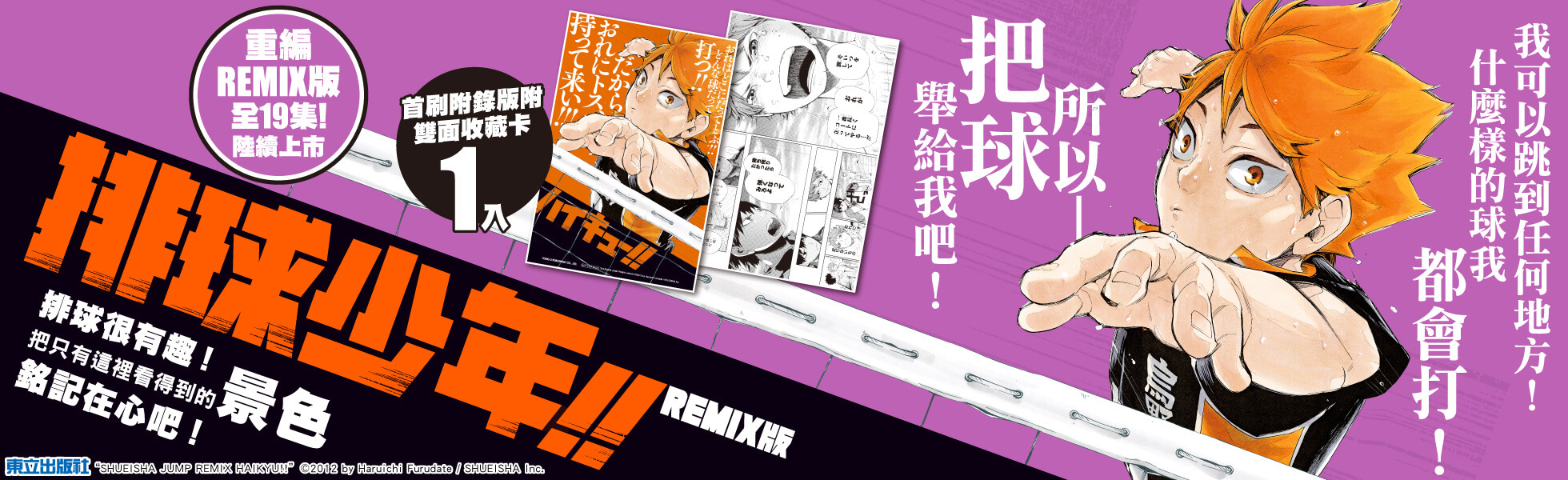 排球很有趣!把只有這裡看得到的景色銘記在心吧!日向翔陽因為崇拜「小巨人」而開始打排球。他迎來國中第一場也是最後一場正式比賽,卻慘敗給擁有影山飛雄的強校。日向誓言報仇,並敲開了烏野高中排球隊的大門,卻在那裡看到影山的身影!兩人馬上起了衝突,結果被趕出體育館…?首刷附錄收藏卡 約10*15 cm 紙