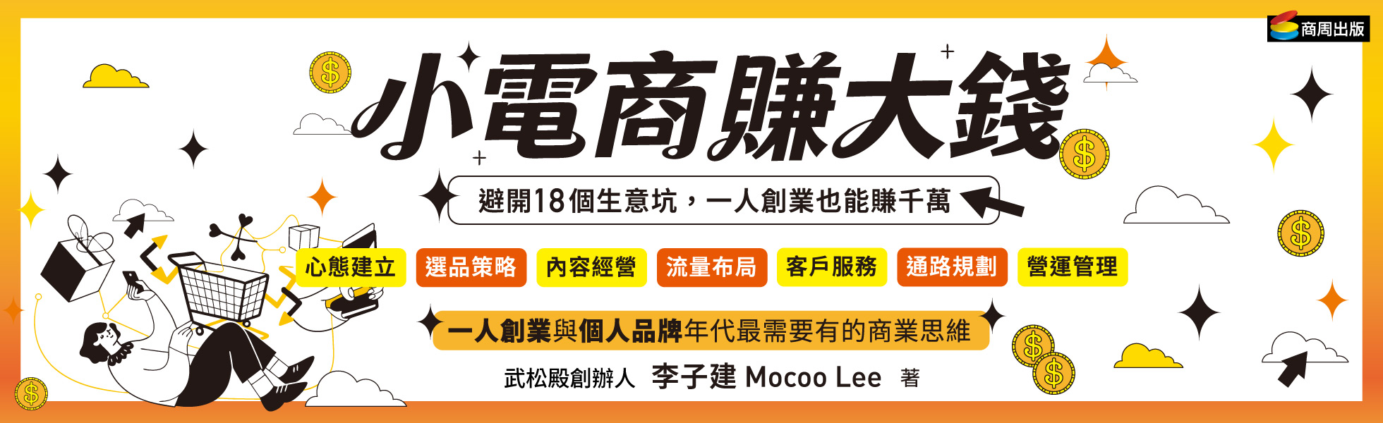 心態建立.選品策略.內容經營.流量布局.客戶服務.通路規劃.營運管理——「一人創業」與「個人品牌」年代最需要有的商業思維——實戰經驗 X 致勝心法 X 商業模式 X 完整系統——創業家Mocoo Lee從負債到上億營收,教你打造自由獲利新人生。電商創業家李子建Mocoo Lee分享從負債累累到建立多個品牌的經驗,希望有志做電商、建立個人品牌的創業者能學習他的血淚教訓,在激烈的市場競爭中存活下來。只要能避開這18個坑,就能領先87%的競爭者。內容包括四大面向◆ 心態建立:探討創業時最重要的心態、盤點內在能量。◆ 產品選擇:如何選擇有市場、有盈利潛力的產品。◆ 行銷布局:分析流量的本質與布局方法,精準吸引目標客群,並分享經營粉絲團與廣告投放的經驗。◆ 營運管理:靈活使用財務三表,用表格建立標準化的營運流程,讓AI完成重複性工作。本書特色◆ 引導你盤點自己的差異化價值,找會賣的產品,做有內容的品牌經營。◆ 看懂更要動手做,每章設計了練習作業,讀完就等於完成一份屬於自己的「小電商實戰規劃」。◆ 設計「小成功執行力推動法」、「90天衝刺計畫」等實用工具,協助你盤點現狀、規劃行動。小電商這樣打造自由獲利新人生——◆ 用自己的獨特價值開發品牌。◆ 不憑感覺不跟風,選擇能解決客戶痛點的產品。◆ 靠內容經營獲得流量,把新客養成會回購的鐵粉。◆ 會投放廣告、流量管理。◆ 有一套符合品牌路線的通路策略。◆ 規劃完整的業績節奏,打造穩定獲利的商業模式。◆ 善用外包與AI提升工作效率,一人創造多人價值。◆ 用報表做系統化管理,高效率衝刺、計畫達標!這本書寫給——◆ 想做電商但不知道如何開始的新手。◆ 想讓品牌經營更穩定順暢的創業者、小公司老闆。◆ 想進一步了解電商商業模式與策略規劃的執行者。◆ 想學習實戰經驗與落地方法的經營者。
