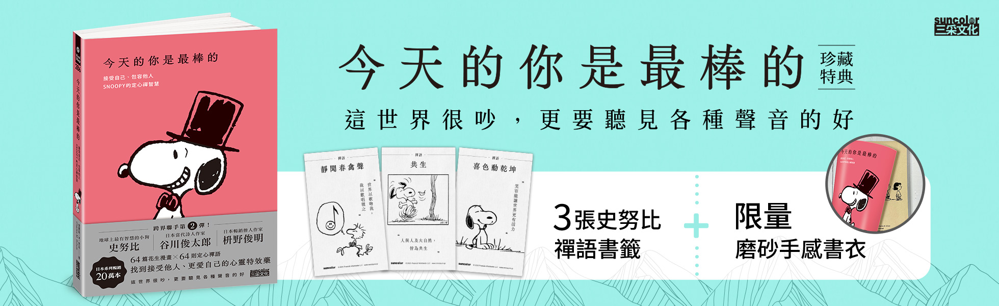 耗時6個月爭取 美國PEANUTS授權‧史努比禪語書籤 日本光文社設計‧高帽子書衣特裝版 \\// 2024年暢銷書《今天不會都是壞事》 最強禪語錄第2彈! 64篇花生漫畫╳64則定心禪語 這世界很吵,更要聽見各種聲音的好 ★★★繁中限定×精裝珍藏版★★★ 首公開 部分彩頁 花生家族彩色小語 【國外暢銷佳績/得獎紀錄】 ●**2024年暢銷TOP3 ●***2024年中文新書暢銷TOP13 ●日本系列暢銷31萬本 【內容簡介】 入世禪僧枡野俊明用最接地氣、淺演易懂的白話文字,教你看懂花生漫畫、體會人生日常。 當SNOOPY遇上禪學,一本讓你在翻閱漫畫、莞爾一笑中,自然理解禪意、明白生活之道,找到接受他人、更愛自己的療癒之書! 這次的主題是「多元美好」! 這世界不是只有一種聲音,每一個你、每一個我、每一個他都是獨特的。 64篇花生漫畫╳64則定心禪語,在你失去自信、無法與旁人好好相處時,陪伴你發掘、體會、接納世界的各種聲音。 ┏・━・━・━・━・━・━・━・━・━・━・┓ 舒茲工作室首度公開全彩呈現 花生家族彩色小語 ┗・━・━・━・━・━・━・━・━・━・━・┛ ▎那個人真不合群、好奇怪? 查理布朗:「我們都有點像呢。」 WE’RE ALL A LITTLE THAT WAY! >>>禪語:且坐喫茶(過度的正義極可能會變成暴力) ▎我覺得自己一點用也沒有! 史努比:「我是唯一無二的狗!」 NOT “A” DOG…“THE” DOG! >>>禪語:宇宙無雙日乾坤只一人(宇宙沒有第二個太陽,天地之間只有一個你) 讓「花生漫畫」各角色陪你學禪語,在你對自己失去信心、莫名感到壓力、煩惱如何與周圍的人相處時。 這會是你想要打開閱讀的書,找到積極生活的力量。 讀者好評: ◆想要心情沉靜的時候,這本書給我好多安定的力量。 ◆萬事道理是一樣的,很高興我被史努比療癒了。 【本書特色】 ◤好評再延續!硬殼精裝珍藏版◢ 最美的史努比禮物書!精選水彩紋理搭配輕量塗佈層的麗奇映畫用紙,溫潤手感呈現SNOOPY禪語錄的沉穩與定心。自用珍藏或心意餽贈,都極具價值。
