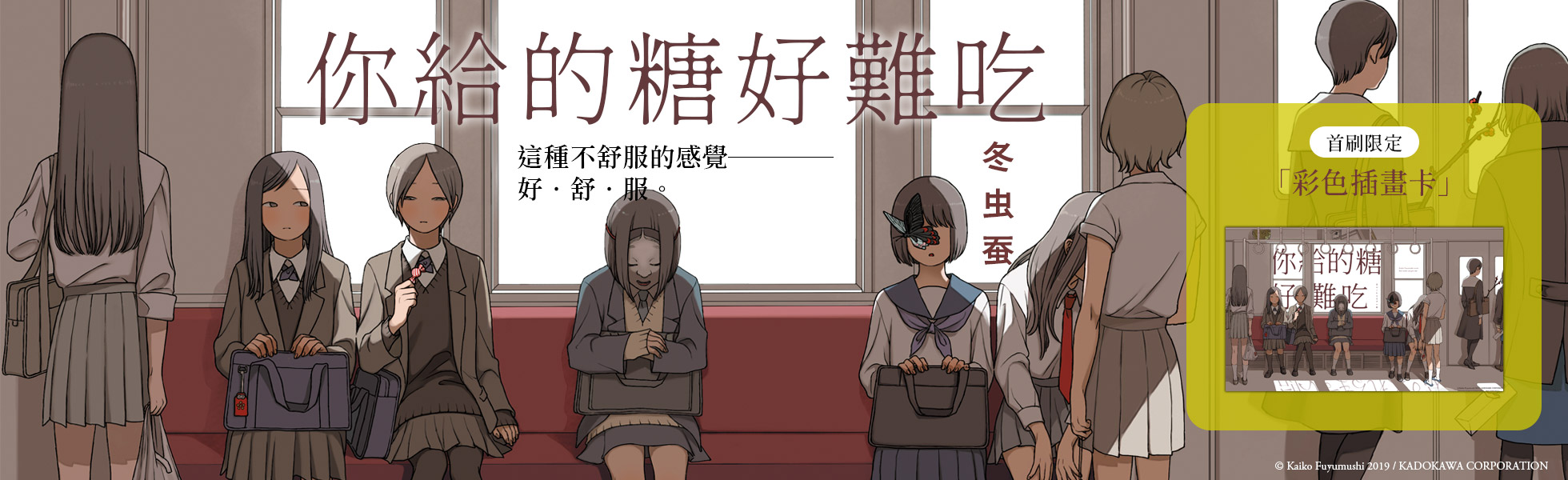 這種不舒服的感覺——好.舒.服。單則短篇漫畫突破13,000,000觀看數——百合、獵奇、抑鬱、詭譎……無法被定義的「冬虫蚕」,活在世上每個「好難吃」的瞬間。✦ ✦ ✦❝ 最受矚目的「超大型新人」 ❞以幽微情感描寫及獨特世界觀深受讀者喜愛的冬虫蚕,在 X(前 Twitter)及 pixiv 上發表作品時常引起廣大回響,短篇漫畫〈殘月〉更有破 1300 萬瀏覽數。網友喻其作品為「純文學般的漫畫」,是當今備受矚目的創作者。❝ 最多樣貌的短篇漫畫集 ❞收錄已成夢幻逸品的8篇獨立時期創作,全新繪製的4篇短篇漫畫,以及新增1篇番外作品。虛實交錯的設定、幽微惆悵的情感、引人共鳴的臺詞,共計12篇的豐富短篇漫畫集,一次收藏冬虫蚕的所有風格!❝ 最難以啟齒的黑色心情 ❞矯情糖果,是你盡全力表現的親暱。明明我們都不喜歡吃糖,卻還是盡全力假裝下去。〈你給的糖好難吃〉嫌惡無法適應的鄉下、難以入口的食物、相處不來的同學。這個小鎮,充滿腐敗生物的氣味——〈浮花〉不安暑假開始了。我把變成人魚的摯友,悄悄養在人去樓空的學校游泳池裡。〈適者生存〉傲慢愛管閒事的媽媽終於死了。妹妹卻對挑起家庭重擔的我說:姊姊,妳變得好像媽媽。〈母親與姊姊〉釋懷看著曾經美麗卻意外身亡的妳,在我的房間裡日漸腐化,我感到無比安心。〈溫柔的棺材〉焦躁醒來時,發現身旁躺著另一個我。這世界上不需要兩個我,所以我——掐死了我自己。〈西沉〉恐懼海岬住著會用歌聲魅惑船員的妖怪,那歌聲,好像被大海拖走的小夜……〈潛伏的妖怪〉執念畢業的日子一天天接近,該怎麼做,才能和妳永遠、永遠不分開?〈春蛹〉❝ 最不能錯過的「首刷限定贈品」 ❞首刷隨書附贈「彩色插畫卡」,(H)10.5cm×(W)17.7cm,220g象牙紙,彩色印刷。特製大尺寸卡片,完整呈現書中各篇角色及關鍵物品,相互映照。