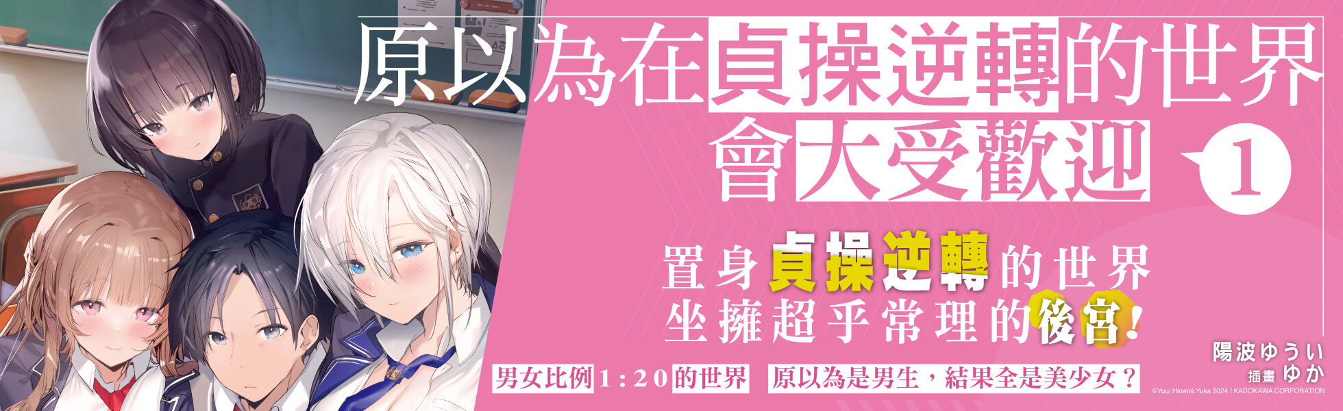 ★桃花不斷超乎常理的後宮!★カクヨム連載小說書籍化!★男女比例1:20的世界?後宮不知不覺擴大中!貞操逆轉世界──那是個男女比例1:20,女性的性欲更強,珍貴的男性們有護衛官保護,生活幸福美滿的夢幻世界。儘管市瀨郁人轉生到這個無疑為後宮的世界十五年了,不知為何始終不受歡迎。郁人感嘆原因出在自己的身邊都是帥氣的護衛官,其中自己的死黨遠坂留衣更是出眾……但其實這些護衛官都是女扮男裝的美少女!完全沒有察覺的郁人,總是毫無戒心地與大家親密接觸,讓每個女生都覺得自己有機會。就在他的後宮不知不覺間形成之時,想要被他當成女生看待的留衣竟然將真相全盤托出──?大受歡迎,桃花不斷的後宮戀愛喜劇開幕!©Yuui Hinami,Yuka 2024 / KADOKAWA CORPORATION