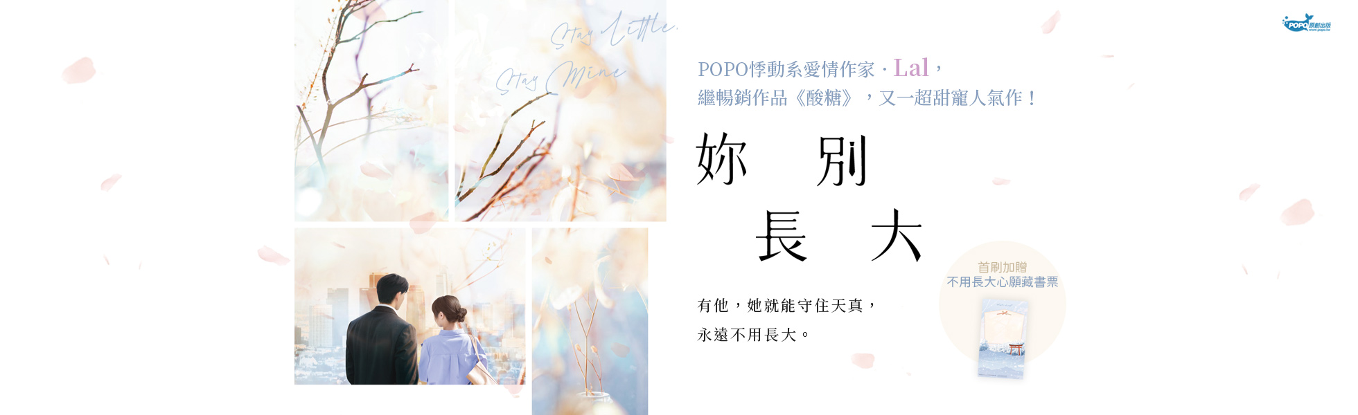 ★長踞POPO濃情館人氣榜、珍珠榜、收藏榜TOP1★站上總點閱突破350萬 POPO悸動系愛情作家.Lal繼暢銷作品《酸糖》,又一超甜寵人氣作!有他,她就能守住天真,永遠不用長大。♛收錄最新番外〈最後的求婚〉♛首刷加贈:不用長大心願藏書票(※首刷後即無贈品)「離開公司後,喊『哥哥』就可以了。」「周敘你!」「對哥哥這麼沒大沒小,可以嗎?」性格開朗直爽的孫露,活得純粹,心事藏不住,身為社會新鮮人,她有著熱情、衝勁與無人能敵的樂觀。然而,大人的世界不如她所想,她的直言不諱,聽在主管耳裡又名「叛逆難搞」;她的真心相待,成了親近同事的升職跳板;她的熱心助人,被有心人士惡意陷害,眾人議論紛紛……引以為傲的優點都成了缺點,在這個社會,她似乎格格不入。幸好,她不是一個人──某天,孫露專屬的那間辦公倉庫裡,多了另一張辦公桌,穩重沉穩的新進員工周敘,成為孫露唯一的好同事。他不在意孫露的口不擇言,甚至護著她的任性,讓她保有天真。「我⋯⋯才不是小孩。」「在我面前,妳永遠都可以是。」一場人事異動讓孫露發現,這些都不是偶然。她才知道,原來,他們的距離這麼遠……