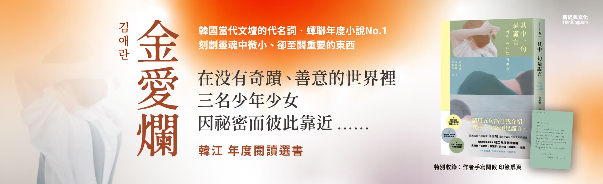 「請用五句話介紹自己,不過,其中一句必須是謊言。」★★★ 諾貝爾文學獎 韓江 年度閱讀選書 ★★★★★ 蟬聯韓國作家票選年度小說No.1 ★★金愛爛對現代社會最鮮明透徹的書寫刻劃靈魂中微小卻至關重要的事物★ 諾貝爾文學獎 韓江:「只要金愛爛出書,我就會讀。」★ 金宥立(小說/詩 製作人):「三名高中生透過謊言而逐漸熟絡,在這個過程中,他們各自失去了珍貴的東西,卻不受自身的痛苦束縛,勇敢擁抱彼此的傷痛。一部感人至深的成長故事。」★ 吳曉樂:「金愛爛擁有一種讓人嫉妒的書寫天賦,那就是讓讀者深信『天啊,她寫的是我』。」★ 教保文庫作家評選年度小說之冠★ Yes24韓國最大網路書店年度選書★ Aladin書店年度選書★ 光州/全南閱讀票選年度最佳圖書★ 擊敗東野圭吾,上市即登上排行榜No.1★ 蟬聯銷售第一,長踞韓國書店暢銷榜★ 吳曉樂(作家)、張慧慈(作家)、蔡宜芳(諮商心理師)、劉梓潔(作家)、韓麗珠(作家) 感動推薦★ 特別收錄:作者手寫問候 印簽扉頁「請用五句話介紹自己,不過,其中一句必須是謊言。」導師親切地說。「我喜歡畫畫。」素莉開始回答。「我小時候踩過釘子,弄傷了腳。」「有時候,我早上會害怕睜開眼睛。」「我曾經因為沒有抓住某人的手,失去了那個人……」當真與假的界線逐漸朦朧,三名各自懷抱著祕密的少年少女,遇見了彼此:少年志宇在母親驟逝後離家,為了能和寵物蜥蜴「龍植」一起生活,一邊到工地打工一邊偷偷畫漫畫上傳論壇,「創作」成了他在現實的夾縫中勉強活下去的出口;女孩素莉同樣失去母親,不同於別人的是,她的雙手擁有能夠感應死亡的能力,卻也沒能預見母親的離世;自那之後,她便緊握畫筆,不再與人碰觸;少年宰雲的母親入獄、父親昏迷在醫院裡,心愛的黃金獵犬「團團」也接著離世,他在罪疚中痛苦掙扎,害怕那天晚上「真正的祕密」有一天會被揭開……他們背負著傷痛,在謊言與祕密之中沉浮。渴望真相,卻也畏懼真相所帶來的重量。在面對羈絆、歉疚與活下去的茫然時,他們將做出怎樣的抉擇?◆ 文壇偶像X各大文學獎肯定X諾貝爾呼聲,對韓國社會最精準的書寫者──金愛爛「大多數的成年人,一生中都會背負著類似的祕密與問題,即便不是什麼嚴重的錯誤,也難以啟齒。可我認為,傷痛並非是因為運氣糟,反而是人生的基本狀態,所有人都無法避免的根本價值。我們總是與失去相伴,會失去人際關係、失去財富,甚至那些看似擁有一切的人也會失去青春。我創作的故事並非出於某種特定的偏好,而是從人生的基本狀態和根本價值出發。我希望,這本書能讓每一個少年少女,都能在祕密與禁忌之中,安全地冒險。」──作者 金愛爛韓國當代最具代表性的小說家,金愛爛,22歲(2002年)初試啼聲,以描寫五個女子宿舍生活的短篇小說〈不敲門的家〉拿下文學大獎;2005年,出版短篇小說集《奔跑吧!爸爸》,成為韓國日報文學獎最年輕的獲獎者,被媒體稱為「韓國文壇最大的收穫之一」,並在書市創造史無前例的暢銷風潮,形成「金愛爛現象」;2013年,再以〈沉默的未來〉拿下國際知名的韓國李箱文學獎,再次寫下最年輕得主的紀錄。金愛爛以其獨特的敘事結構得名,讀者能在閱讀時體驗到每個角色的掙扎,隨著真相逐步揭開,也將讀者帶入深深的情緒之中。這種書寫特別觸動年輕人,讓她被評為是「最關心年輕人生活的作家」、「現代社會生態觀察員」。而身為一名小說家,金愛爛對於「作者該說什麼,以及要如何說」深入思考,在作品中展示小說結構與理解角色之間的關聯,正如同「畫筆必須沾取極少量的白色顏料,才能在人們眼中留下光芒」──表達靈魂微小卻至關重要的東西,也成為了金愛爛每個故事裡的訴求,她以細膩精準的文字,描繪出每個角色的靈魂,完成這個關於人在祕密、謊言與悲傷之中,仍然選擇彼此靠近的故事——真相並非總是光明美好,卻值得我們反覆閱讀回味。