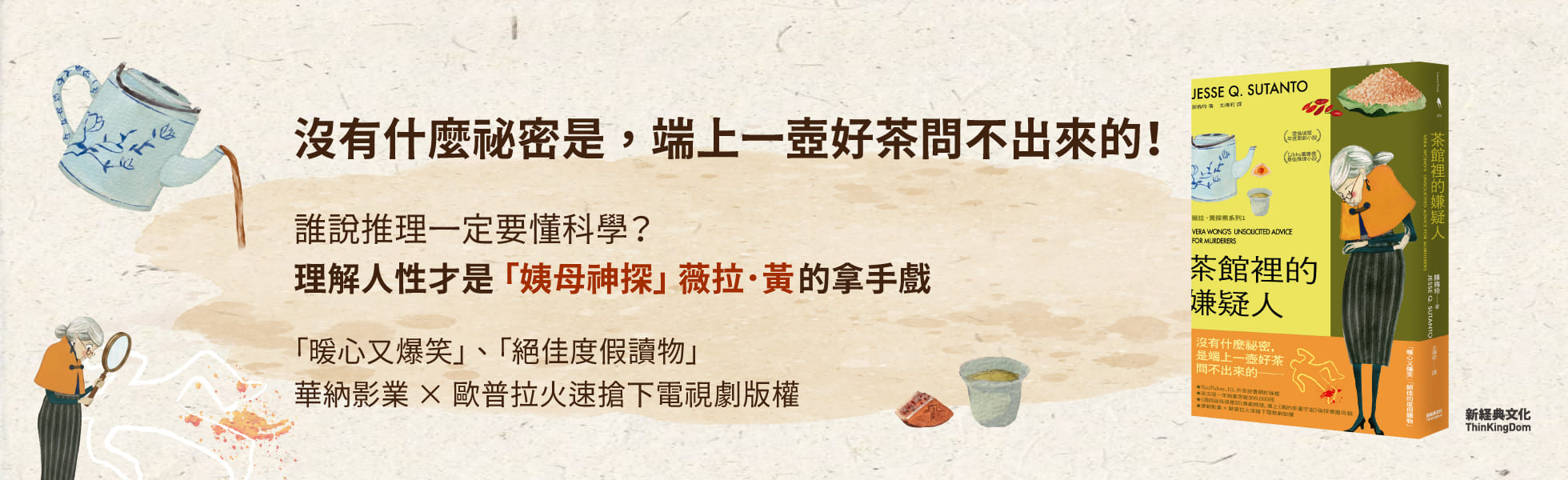 這是樁疑點重重的茶館命案,偏偏來過的人都有不在場證明不過,沒有什麼祕密,是端上一壺好茶問不出來的──「暖心又爆笑」「絕佳的度假讀物」★YouTube、IG、抖音說書網紅強推!★英文版一年銷量突破300,000冊★超級暢銷書《失控親友團》(Dial A For Aunties)作者全新系列★《週四謀殺俱樂部》喜劇推理,遇上《媽的多重宇宙》強悍華裔母親★華納影業 × 歐普拉火速搶下電視劇版權西方有深諳人性的瑪波小姐,東方有窮追不捨的「姨母神探」──薇拉.黃表面是經營茶館的慈祥姨母,實際上是洞悉人性的破案大姐頭推理一定要懂科學? 理解人性才是偵探姨母最拿手的戲。💡薇拉看穿人性的10個瞬間:1. 藉由提供提神茶招待警察,讓他們放下戒心,使自己能名正言順留在現場打探消息。2. 觀察茱麗亞的行為舉止,認定她並非冷酷凶手,而是極需被照顧。3. 看穿瑞基對家常菜的渴望,讓他吃飽後自然吐露祕密。4. 從桑娜的藝術創作讀出她對死者複雜的情緒,進而揭開兩人不為人知的糾葛。5. 洞悉奧利佛從小到大累積的自卑感,使他為了自我證明而洩露祕密。6. 從嫌疑人過度修飾的社群照片讀懂虛榮心,藉此推論其行為動機。7. 藉由年輕人難以拒絕長輩的文化現象,進行身家調查並識破謊言。8. 進入他人家中大掃除觀察居住環境,進而判斷其心理狀態。9. 在死者追思會上冷眼觀察,鎖定那些悲傷得不太自然的嫌疑人。10. 堅信生活失序即心理失序,透過強迫嫌疑人規律作息與進食,觀察其良心。 ──各界榮譽肯定── ★榮獲愛倫坡獎年度原創平裝小說 ★入圍英國犯罪作家協會金匕首獎 ★Audible年度推理好書 ★榮獲Audie獎年度推理有聲書 ★榮獲美國圖書館協會首屆 Libby 圖書獎年度推理小說 ★華盛頓郵報年度十大推理小說 ★出版者週刊、圖書館期刊星號書評推薦 ★售出日本、西班牙、巴西、荷蘭、芬蘭、匈牙利、印尼、保加利亞、西班牙、烏克蘭……16國版權❥關於故事六十歲的薇拉在舊金山唐人街經營一家茶館,每天準時四點半起床,健走、喝烏龍茶、傳訊息叮嚀Gen Z的兒子早起。她的生活井然有序,直到某天清晨,茶館裡多了一具陌生男子的屍體……薇拉報了警,但為了引誘凶手上門,她順手拿走重要物證──畢竟,沒人比她更適合破案。嫌犯一一現身,分別是:死者的雙胞胎弟弟、遺孀、網路新聞記者、Podcast主持人。薇拉以各種茶葉、中華料理款待他們,以為即將揭開凶手真面目,卻因此與這些嫌犯發展美妙情誼。事情一發不可收拾……印尼華裔作家陳梅玲,融合推理懸疑與喜劇,以爆笑筆觸刻劃愛管閒事、碎嘴卻可愛的主角薇拉。從唐人街的茶香,到女人們互相扶持的情誼,一起命案帶出溫馨人情~❥國際媒體盛讚陳梅玲擅長以充滿溫情的筆觸諷刺,在這部引人入勝的懸疑小說中,流露出真摯的幽默與歡樂。──《華盛頓郵報》充滿溫情與幽默的懸疑小說,詳盡描寫茶飲與料理。──《圖書館雜誌》星級評論完美融合愛管閒事的角色、謀殺與類家庭題材。──《BookPage》星級評論薇拉的茶飲和她準備的盛宴,生動的感官描寫提升了本書的療癒魅力。──《科克斯書評》無論陳梅玲寫什麼,都飽含熱情與真心。──《雅加達郵報》❥名家推薦♥「瑪波小姐和福爾摩斯請讓位!薇拉要來破案了!這是一個以非血緣家庭為核心的謀殺謎團,愉快、扣人心弦、讓人放聲大笑。我一翻開就停不下來!」──Jenny L. Howe,《The Make-Up Test》作者♥「大師級的懸疑傑作,簡直是我此生最愛的小說之一,宛如《鋒迴路轉》遇上《房間裡的陌生人》。」──May Cobb,《My Summer Darlings》作者♥「A+,無可挑剔。」──Lauren Ho,《Last Tang Standing》作者♥「我愛死這本書了,愛死充滿鬥志的薇拉!陳梅玲再次帶來笑到流淚的荒唐情節。滿分推薦這趟愉快的閱讀旅程!」──Lynn Painter,《The Love Wager》作者♥「聰明、原創且情感豐沛,整部小說像一個溫暖到令人不想結束的擁抱。」──Laurie Elizabeth Flynn,《The Girls Are All So Nice Here》作者♥「完美無瑕,引人大笑,溫暖人心,創作技巧高超。歡樂的閱讀經驗。」──India Holton,《The League of Gentlewomen Witches》作者♥「溫暖、迷人,令人大笑不斷。」──S. L. Huang,《Zero Sum Game》作者♥「就像一杯完美的茶,層次豐富、精心沖泡,帶著一絲幽默與溫暖甜美的餘韻。」──Amy Clarke,《Girl, 11》作者♥「在這部爆笑推理小說中,薇拉最有理,向我們證明:千萬別惹愛管閒事的姨母。」──Julie Tieu,《Circling Back to You》作者讀者五星好評★★★★★♥「我的生活需要薇拉,還有她的好手藝!這可能是我今年的年度讀物。」♥「如果你喜歡《週四謀殺俱樂部》或其他輕推理小說,你絕對會愛上這本書。」♥「全書充滿溫情、美食,以及那些出自善意的愛管閒事。」♥「這完全是我的菜!」