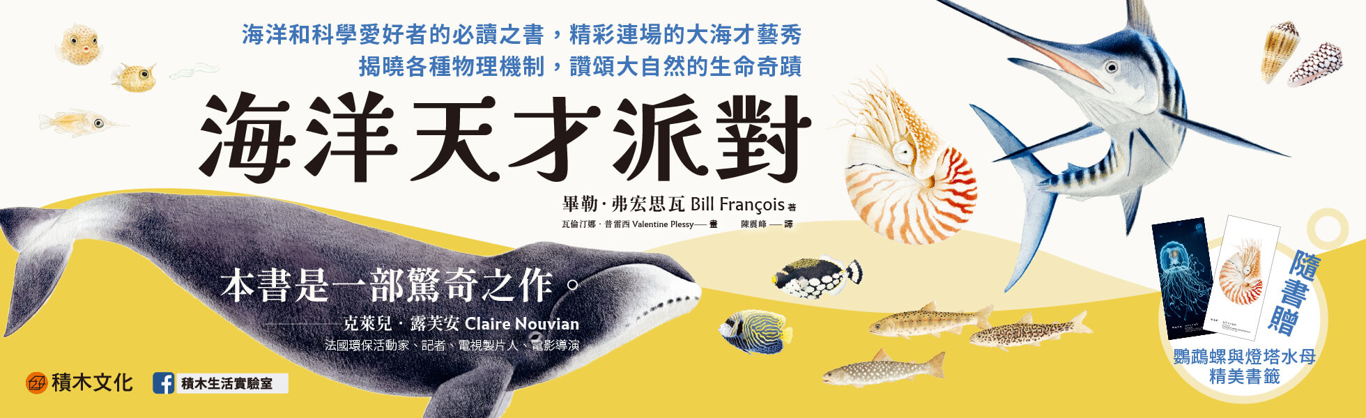 歡迎光臨驚才絕艷之海── 「跟牡蠣一樣笨」?「跟金魚一樣健忘」? 事實絕非如此——海洋是天才的舞台! 天才科學家、博物學家、演說家畢勒.弗宏思瓦 (Bill François) 化身熱情的說書人,深入解析海洋動物的十八般武藝, 以嚴謹卻不失幽默的筆觸,為我們揭曉各種物理機制 如何在水中將不可能化為可能── 牠不用休息, 就能環遊世界。 牠的一生, 都在外殼上開發演算法。 牠終其一生, 可以成長八千萬倍。 牠只要吸一口氣, 就能下潛兩千公尺。 牠無視時間的流逝, 成為了不朽。 「本書是一部驚奇之作。人類及其毀滅性的瘋狂舉動,使其他物種面臨生存危機,而本書則在此時引領讀者,學習如何看見周遭生命的特異才能與驚人之美。」──克萊兒.露芙安(Claire Nouvian)(法國環保活動家、記者、電視製片人、電影導演) 【本書特色】 ◆跟著暢銷作家探索多種海洋生物的看家本領,讚頌大自然的生命奇蹟。 ◆圖文並茂,插畫精美,沉浸於欣賞精彩絕倫的大海才藝秀。 ◆充滿熱情的敘述,結合不失幽默的嚴謹性,是海洋和科學愛好者的必讀之書! ◆鸚鵡螺與燈塔水母二重奏,兩款精美書籤隨書贈送! 煮沸海水的蝦子、 修復我們氣候的浮游生物、 抹香鯨的聲納、 鯊魚吻部的電磁感應、 鯷魚的隱形斗篷、 芋螺嚴格加密的程式碼、 蓄電的電鱝、 存活超過一萬年的海綿…… 對於懂得觀察牠們的人來說,一些魚類、軟體動物和貝類都可以成為地球未來的工程師、航海家、繪畫高手和醫生。 「科學就如同海洋,持續浮現嶄新的事物。就在自覺理解世界全貌的時刻,一片意想不到的鰭、一抹預料之外的倒影,卻突然顯現—這正是未知世界的魅力所在。」──後記 【驚艷推薦】 Spark 趙健舜(「潛進台灣」、「BlueTrend藍色脈動」網站創辦人) 林子皓(中央研究院生物多樣性研究中心副研究員) 張東君(科普作家) 陳天任(國立臺灣海洋大學海洋生物研究所教授) 曾文宣(《泛科學》《國語日報》專欄作家,高中生物科教師) 「有些書,光是圖片就非常值得閱讀。而當她又具有知識性(或文學性)的時候,就是絕對需要收藏、珍藏的重點書了。 法國的海洋研究者、雅克·庫斯托(Jacques Cousteau)船長的裝備一直都是我從小聽、看到大,覺得很羨慕的。這本書中將各種海洋與生物的知識化成易懂、閒聊時的主題,再逐漸融入生活成為常識的手法更是了不起。 我們常看見台灣,從圍繞著台灣的海洋認識起,不是更有『深度』嗎?」──張東君 【魚兒天生會游泳?】 游泳對於小型魚類而言,有可能是伴隨一生的挑戰——隨著體型成長,魚類必須持續學習游泳的方式,每個階段有所不同。大多數魚類都是由極其微小的魚卵孵化,其後持續成長不斷,巨大的鮪魚和翻車魨,剛出生時也只有米粒大。體型如此微小的動物,將會承受每個水分子帶來的衝擊效應。小魚必須設法在水分子之中,開闢出一條生路,水的黏稠程度就好比人類在蜂蜜中游泳一樣吃力。由於只能緩慢移動,幼體的外表渾圓、布滿鋸齒與棘刺,頭部巨大。翻車魚的幼體看起來就像是一顆小太陽,外圍兜著一圈三角形的光芒。 【魚寶寶的社群網路】 汪洋中的稚魚,怎樣熟練地返回千里之外的出生地?體型這麼小,如何確保不會隨波逐流?原來幼體配備了一套強大的演算法,比人類汽車上的電腦的性能還要良好,讓牠們隨時調整游泳的方向,並配合洋流,逐漸靠近目的地。而且在海洋中,許多動物在產卵後就任其漂流,藉由幼體的擴散,整個海洋得以相互連結,宛如龐大的網路,沿岸的棲息地也因此能彼此溝通交流。 【沙丁魚決戰鮪魚】 一群小魚在面對攻擊者時,很少直接反擊。魚群往往會在水中排列出各種複雜的圖形來干擾敵人,混淆視聽,甚至將掠食者包圍在一個移動的氣泡中,使其迷失方向。然而,鮪魚還留了一手。牠很清楚,魚群的力量來源,同時也是其弱點所在。大量個體聚集在一起,就像名副其實的「擠沙丁魚」。鮪魚巧妙利用了這一點,在身上點綴了眩目的「電光藍」條紋,這種顏色會讓沙丁魚更加害怕,靠得更緊,掠食者就只需要衝向擠成一團的魚群就可以了。 【誰是潛水冠軍?】 海洋哺乳動物在潛水前不會吸氣,而是盡可能將肺中的空氣排出?原來,如果想潛得非常深,把空氣儲存在肺部並不是個好策略。 抹香鯨是潛水高手,最深可達兩千多公尺,但鯨豚類的肺部其實非常小,因為功能並非儲存空氣,若對比其體型,鯨豚肺部所佔的體積,大約只有人類的三分之一! 但原來,抹香鯨也不是潛水冠軍。 【小蝦米養活大海】 磷蝦之於海洋,就如同小麥之於麵包店一樣重要。從巨大的鯨魚到小小的鯖魚,連同企鵝、海豚、信天翁等數不清的物種,都仰賴磷蝦生存。 但這不起眼的小蝦米不僅僅是海洋食物鏈的支柱,牠們甚至能影響氣候。 【越界之徒鮭魚】 鹽可以分隔魚類,也可以分隔法國人。大家都知道法國人選擇奶油時,分為無鹽及有鹽兩派,各有擁護者。在魚類的世界中,也有同樣的區隔——淡水魚在海中無法存活太久,而淡水對鹹水魚而言也同等致命。這是因為有一項嚴格的定理,也就是「滲透作用」,支配著水中所有的生命。 海裡的魚類需要不停地喝水,而淡水魚則必須不停地排尿……因此就不難理解魚類為何需要發展出各種適應能力,而且大多只能針對其中一種環境的限制進行調適,因為如果要同時滿足兩種環境的需求,會相當困難。雖然困
