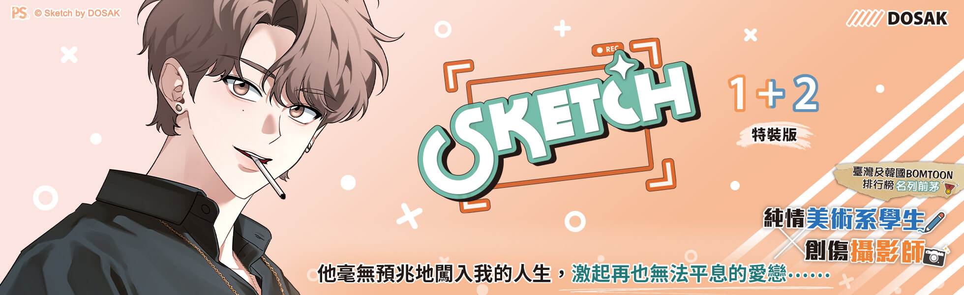臺灣及韓國BOMTOON排行榜名列前茅🏅 ✏️純情美術系學生╳創傷攝影師📷 他毫無預兆地闖入我的人生, 激起再也無法平息的愛戀…… ※特裝版內含特別授權的韓國特裝版周邊圖💝! ※蝴蝶頁印有DOSAK老師超可愛的Q版簽繪,快手刀收藏! ※面對年下狗狗的橫衝直撞式告白,久經情場的老手要受不了啦~~ 特裝版內容: 1.《Sketch》第1集、第2集 2. 磁吸壓克力吊飾(共2款) 3. 小卡資料夾(共2款) 4. 拍立得(共8款) 5. 精選美術集 臺灣及韓國BOMTOON排行榜名列前茅🏅 ?封收錄韓版晝濱FOCUS封面圖! ✏️純情美術系學生╳創傷攝影師📷 他毫無預兆地闖入我的人生, 激起再也無法平息的愛戀…… 當以暻試圖逃脫令他煩躁的聚會,「他」出現了……精緻的五官、平易近人的氣質,讓以暻不由自主地上前搭話。那天的短暫相遇讓以暻難以忘懷,更在因緣際會下,成為對方的模特兒,也終於得知男人的姓名,李晝濱。數次像是精心策劃的巧合,讓他的心意再也壓抑不住……
