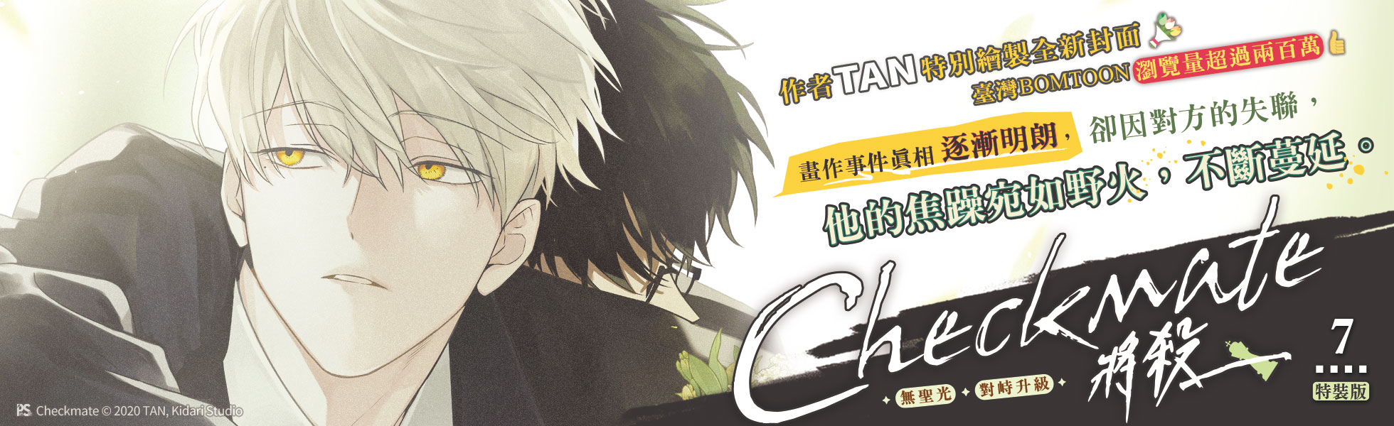 ❣無聖光❣對峙升級❣ ✨隨書附贈經典畫面小卡x1✨ 畫作事件真相逐漸明朗, 卻因對方的失聯, 他的焦躁宛如野火,不斷蔓延。 ※📣超人氣作品續集無聖光火熱回歸!! ※臺灣BOMTOON瀏覽量超過兩百萬👍 ※作者TAN特別繪製全新封面✨ 特裝版內容: 1.《將殺Checkmate》第7集 2.壓克力明信片+郵票組 3.【賢夜】金屬徽章 4.燙銀造型卡片(共4張) ❣無聖光❣對峙升級❣ ✨隨書附贈經典畫面小卡x1✨ 畫作事件真相逐漸明朗, 卻因對方的失聯, 他的焦躁宛如野火,不斷蔓延。 眼看李書賢行事作風越來越偏執,鄭銀晟本想終止交易,卻遭到對方強烈反對。而他也深知,李書賢向來不按牌理出牌,於是正式邀請金記者加入行動,從旁照應李書賢,但接連不斷的壓力與衝突讓他身心俱疲……哪怕鄭銀晟為了他選擇妥協,李書賢心底的不安沒有絲毫減少──那個人曾從自己的生命中消失過,那種失落,李書賢真的不想承受第二次……