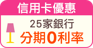 • 信用卡分期零利率期數:3期/6期,請依各商品頁標示為準