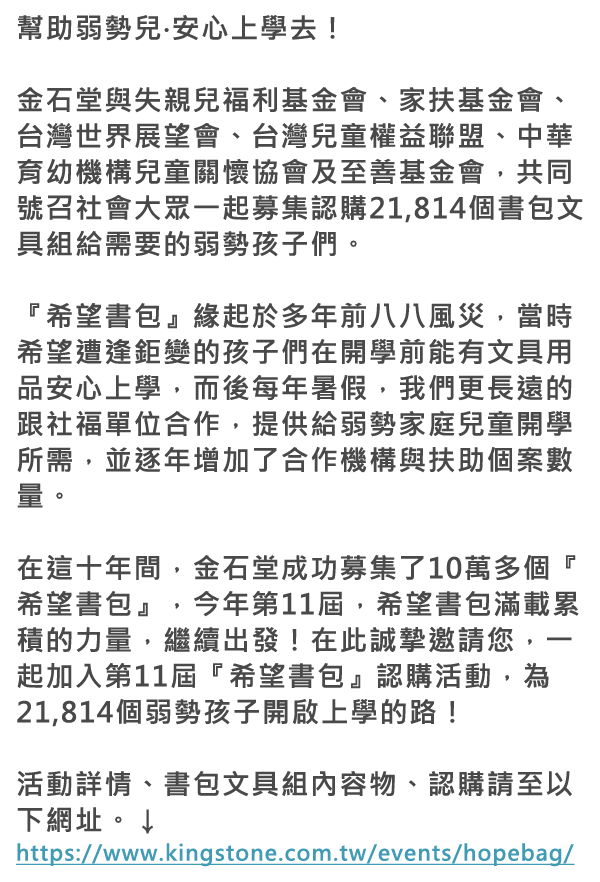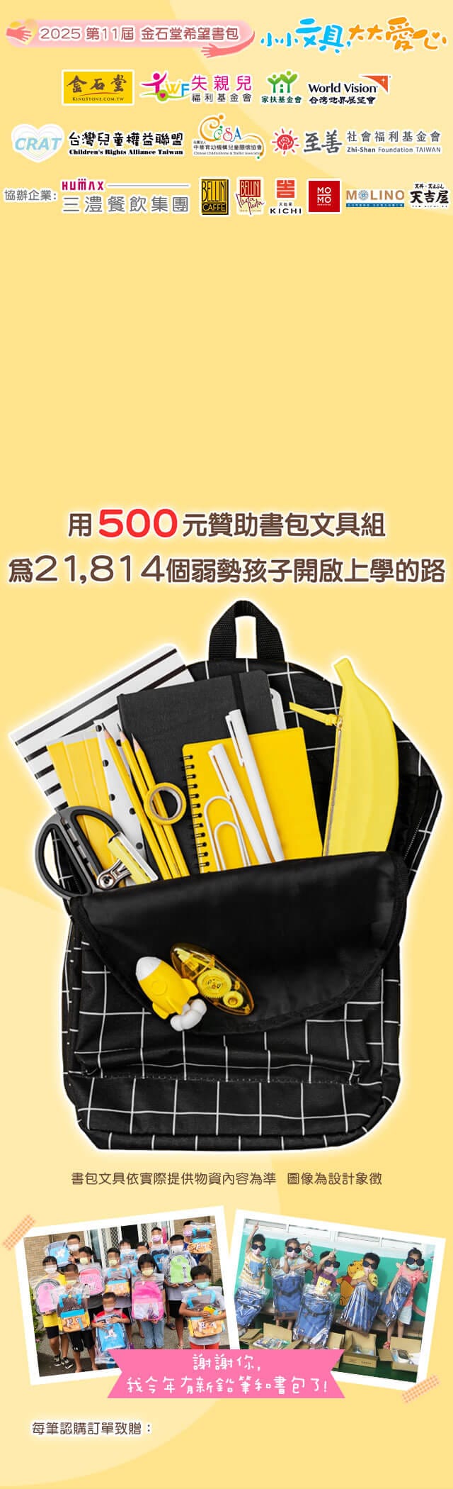 - 認購「希望書包」完成後恕無法取消訂單,感謝您的愛心!