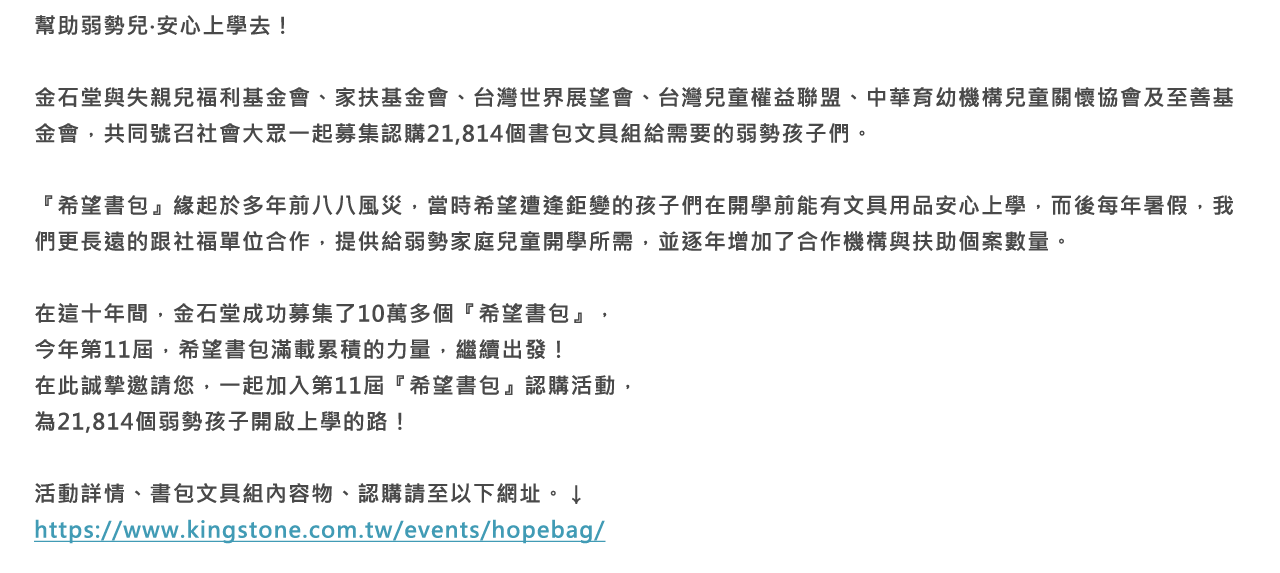 - 「希望書包」企業/團體/非會員 認購諮詢專線:02-2369-7879 #213 范先生。服務時間:週一至週五 9:30~12:30 | 14:00~17:00 (國定假日除外)
