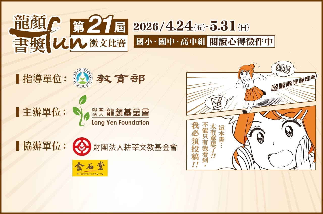 - 影音投稿:時長3分鐘內,鏡頭與聲音限本人出演,禁止運用 AI 生成內容或美顏/變聲濾鏡。影片請上傳至個人YouTube頻道,標題須含「【第 21 屆龍顏 FUN 書獎】」,設定為「公開」,提供影片連結網址投稿。