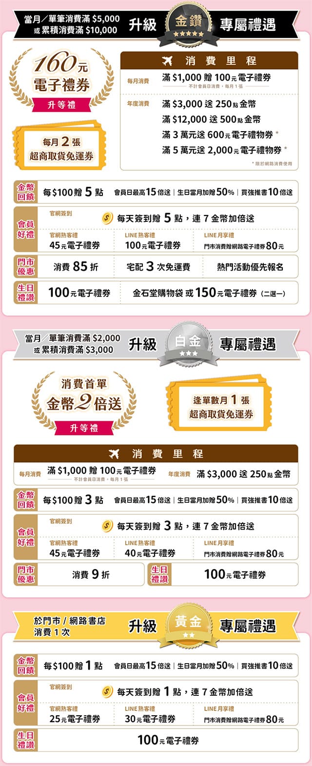 | 升等禮 | 160元電子禮券 | 首筆金幣加贈100% | ─ |