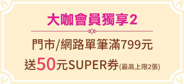 [大咖獨享2]門市/網路單筆滿799元送50元SUPER券