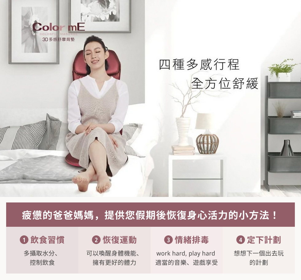 疲憊的爸爸媽媽,提供您假期後恢復身心活力的小方法!1.飲食習慣:多攝取水分、及控制飲食 2.恢復運動:可以喚醒身體機能、擁有更好的體力 3.情緒排毒:work hard, play hard 適當的音樂、遊戲享受 4.定下計劃:想想下一個出去玩的計劃